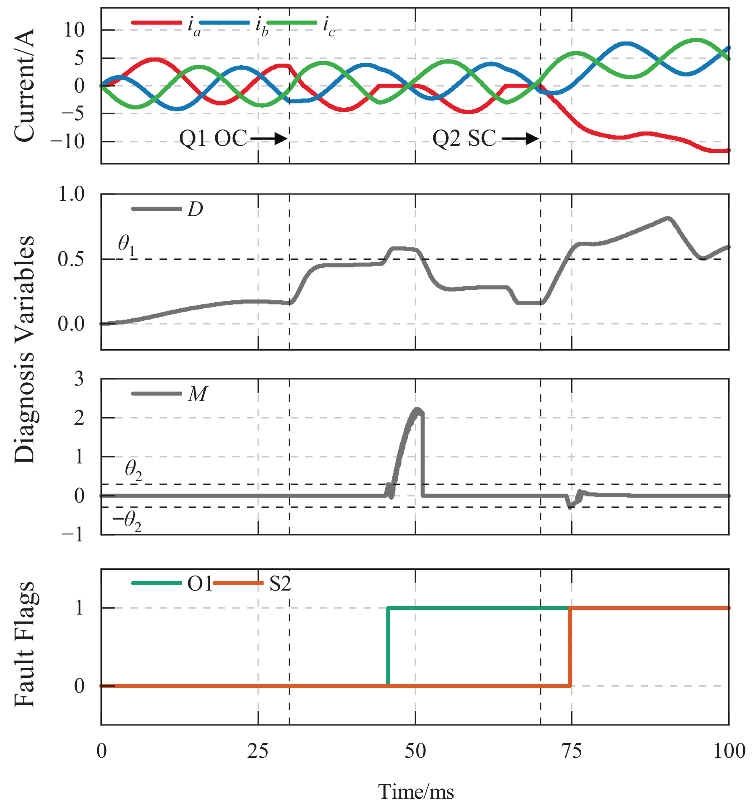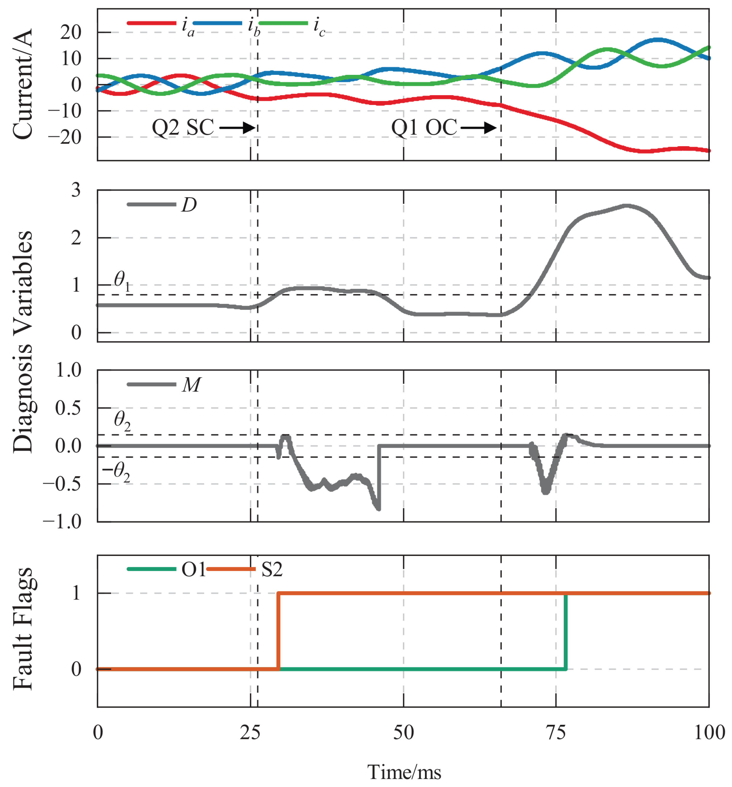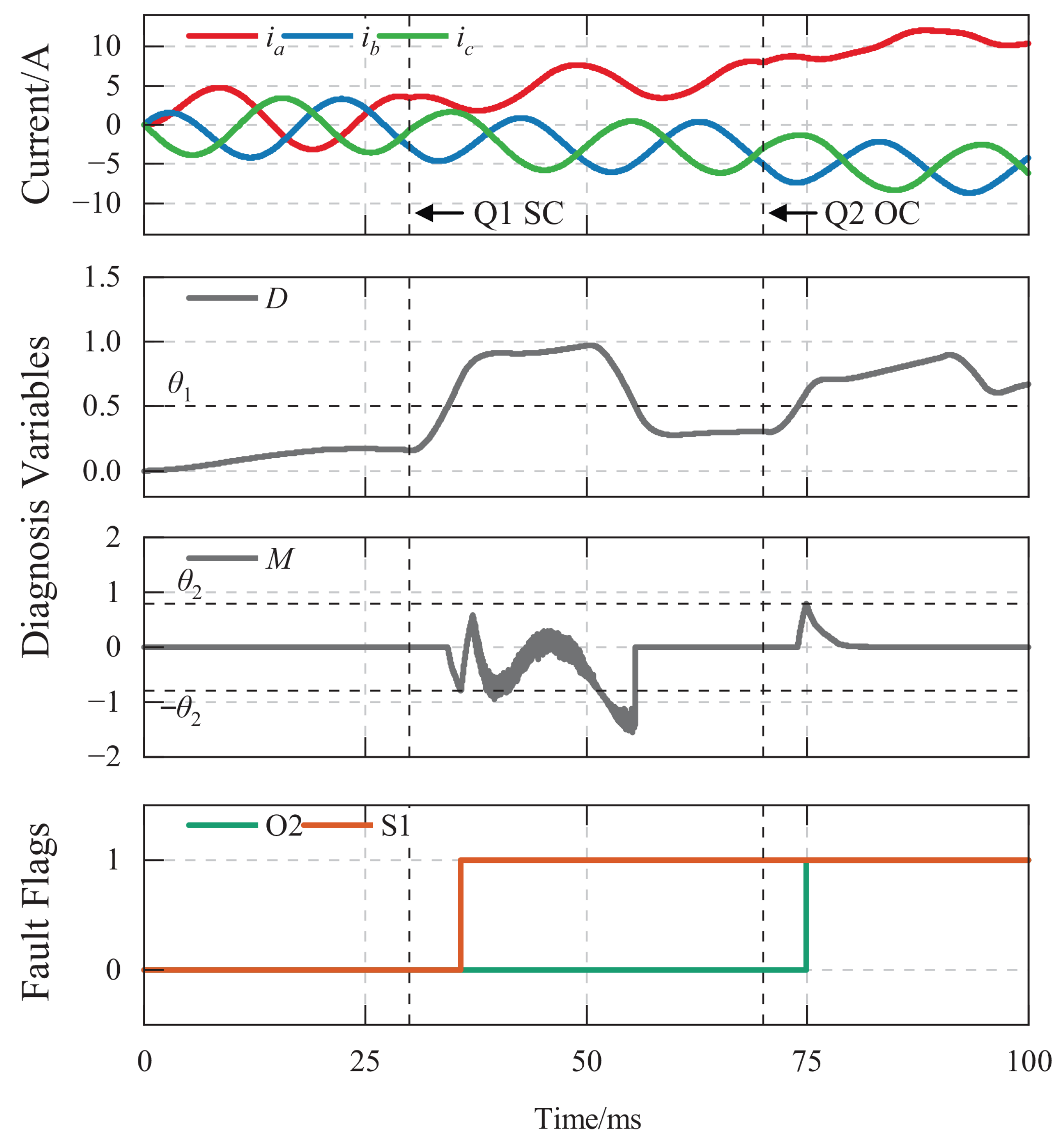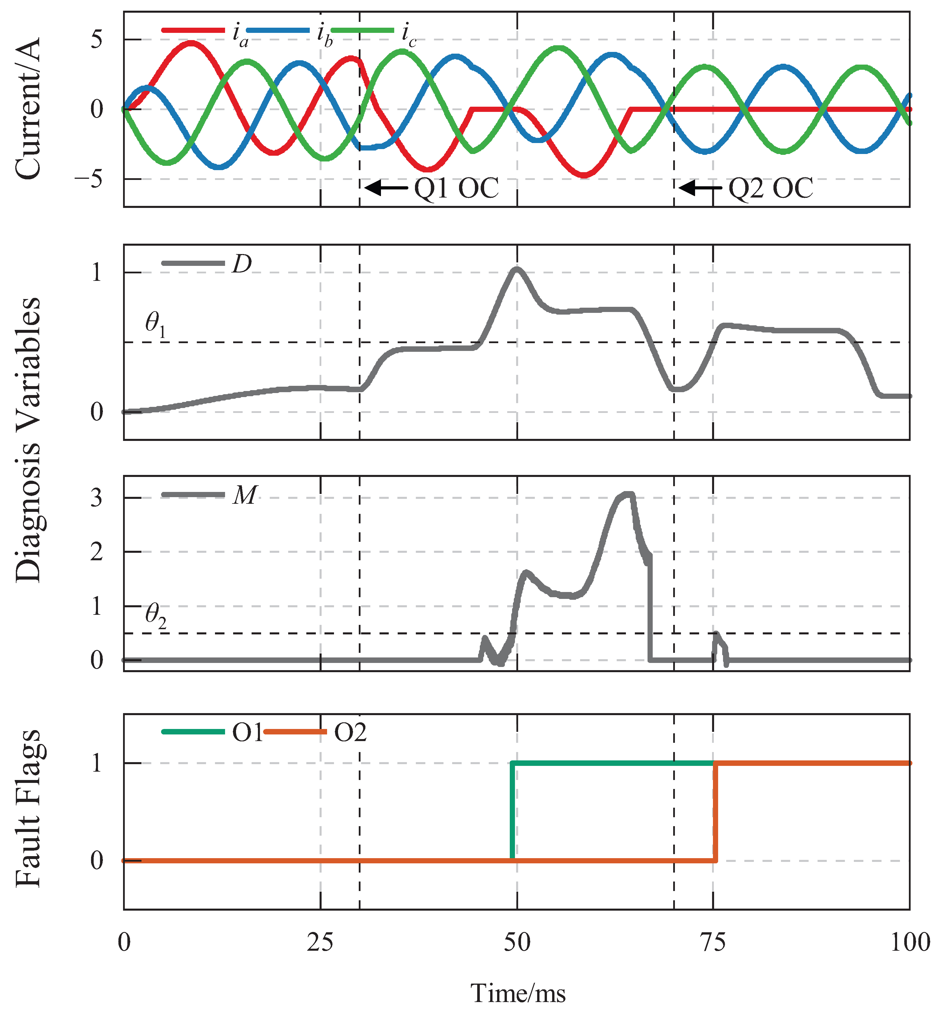 - Wang, R.; Liao, M.; Song, L.; Guo, X.; Liang, Y. A Fault Diagnosis Method for Open-Circuit Faults Based Voltage Vector Trajectory Distortion Characteristics in Three-Level T-Type Inverters. IEEE J. Emerg. Sel. Top. Power Electron. 2025, 13, 5317–5333. [Google Scholar] [CrossRef]