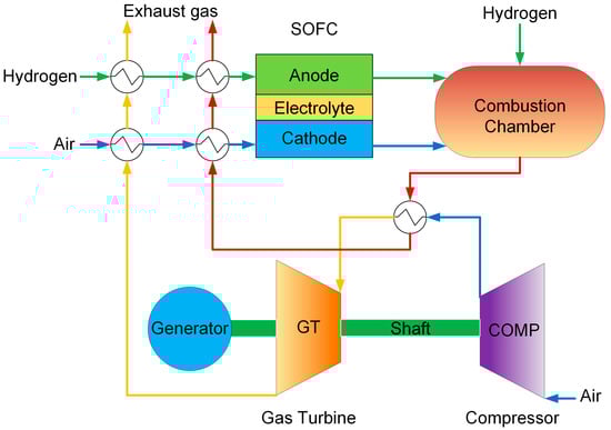 The global transition toward low-carbon energy systems has spurred intensive research into high-efficiency, low-emission power generation technologies. The solid oxide fuel cell–gas turbine (SOFC-GT) hybrid system has thus emerged as a highly promising solution, integrating the high electrochemical efficiency of SOFCs with the thermodynamic advantages of gas turbines (GTs) [1,2]. Its theoretical efficiency can exceed 70% [3]. Capable of flexibly employing a range of fuels (e.g., hydrogen, natural gas, and biogas) and mitigating greenhouse gas emissions, this hybrid system holds significant importance in distributed power generation and industrial combined heat and power (CHP) applications [4,5].