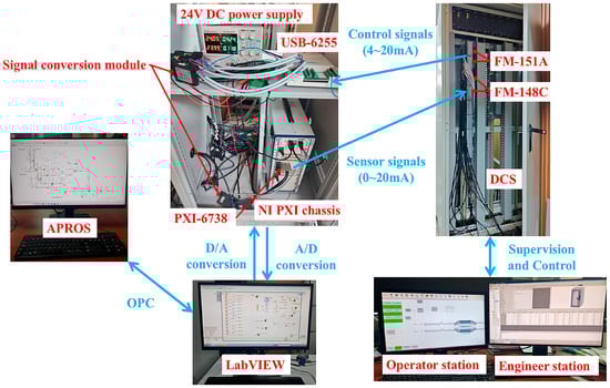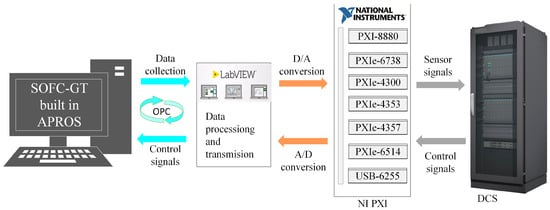 The basic structure of the C-HILS platform is illustrated in Figure 2. This platform comprises four key components: APROS, NI PXI hardware, LabVIEW graphical programming software, and the HOLLiAS MACS-FM DCS. In this study, the SOFC-GT bottoming cycle hybrid power generation system, constructed within APROS, functions as the digital simulation module. The DCS is integrated into the simulation loop as the control hardware, where HMI configuration and control logic configuration are implemented to enable real-time monitoring and control. NI PXI hardware and LabVIEW software serve as the data transmission interface between APROS and the DCS.