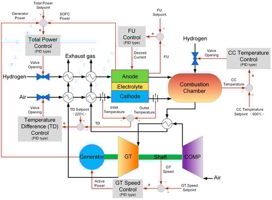 - Chen, J.; Liang, M.; Zhang, H.; Weng, S. Study on control strategy for a SOFC-GT hybrid system with anode and cathode recirculation loops. Int. J. Hydrogen Energy 2017, 42, 29422–29432. [Google Scholar] [CrossRef]