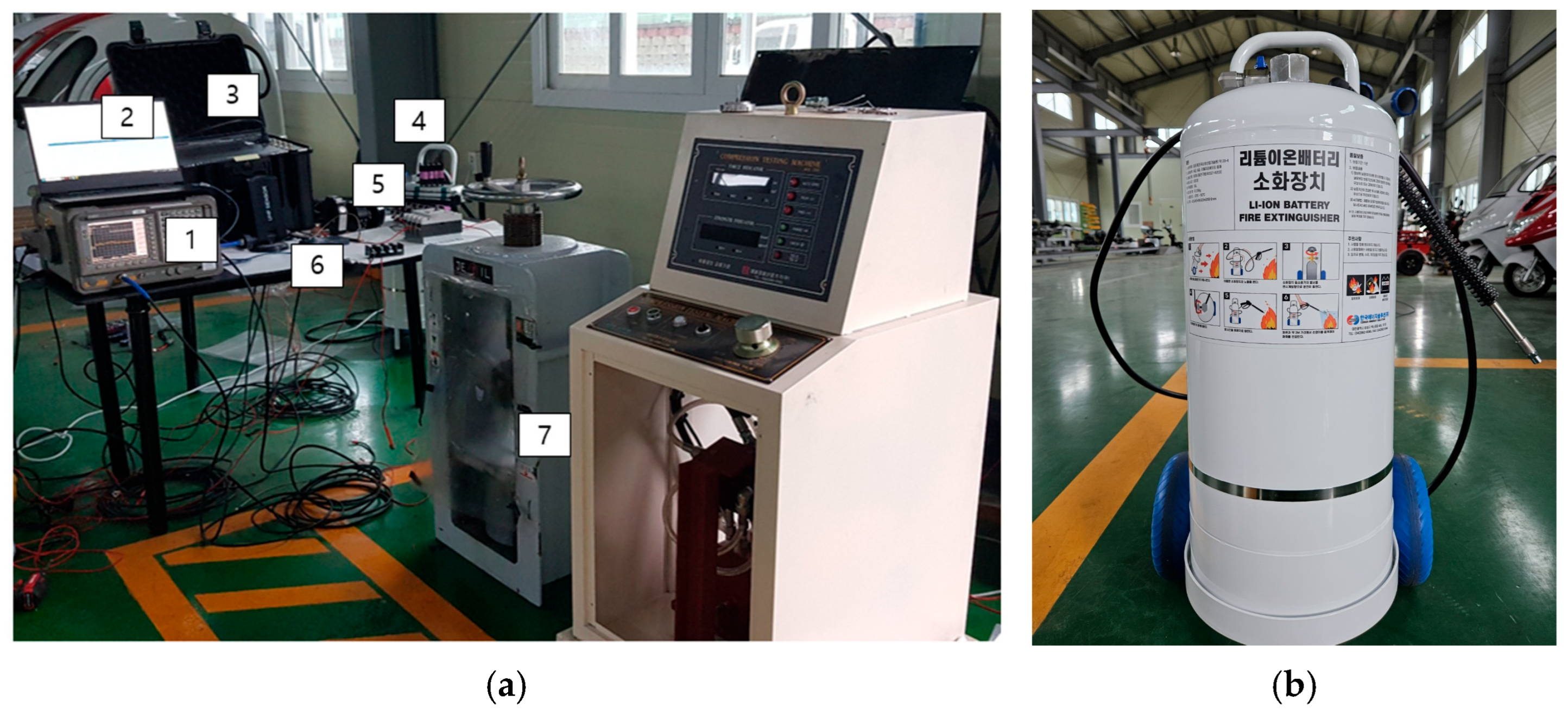 Figure 3b presents the dedicated lithium-ion battery fire extinguisher system integrated to ensure safety during destructive testing.