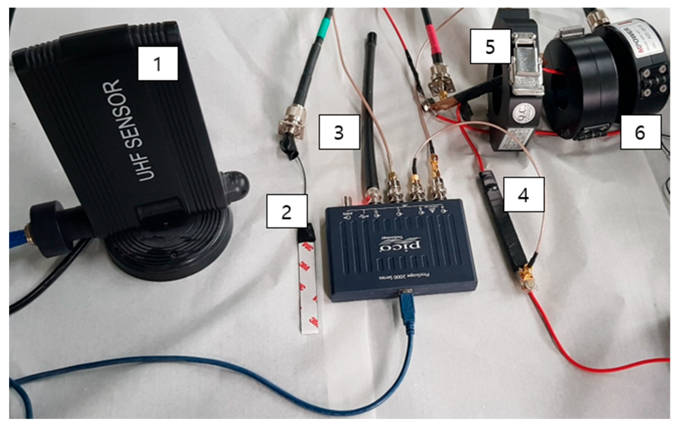 To ensure measurement reliability, all tests were repeated three times per condition, and the obtained signals were averaged to eliminate random noise. Environmental factors such as temperature and humidity were carefully controlled. Defect signals were identified when their amplitudes exceeded predefined thresholds (250 mV for the HFCT and 2 V for the electromagnetic antennas), based on the CMV baseline values recorded during steady-state operation.