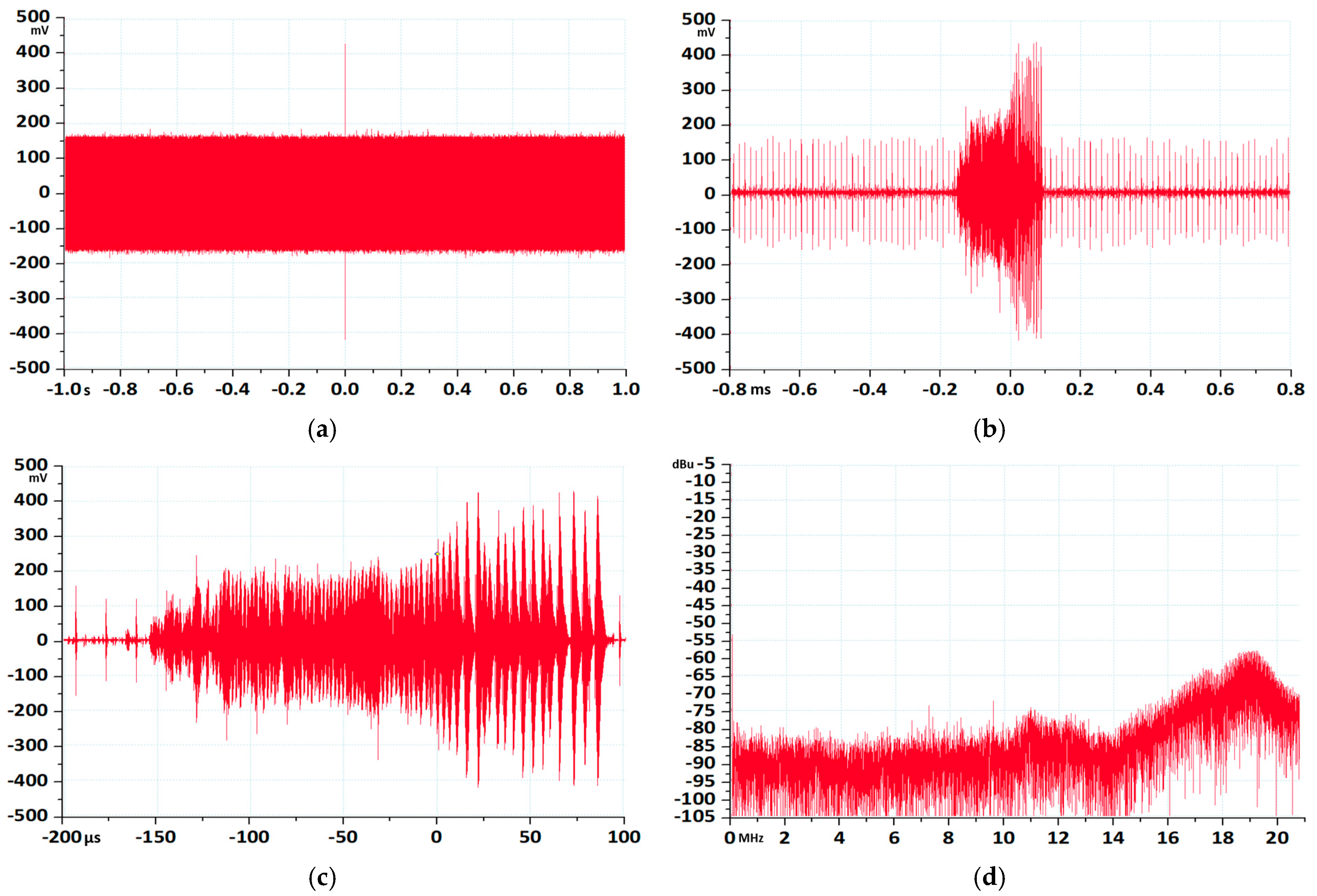 Figure 6a, the HFCT-detected signals exhibited amplitudes exceeding 250 mV, clearly distinguishable from the CMV noise levels below 200 mV.