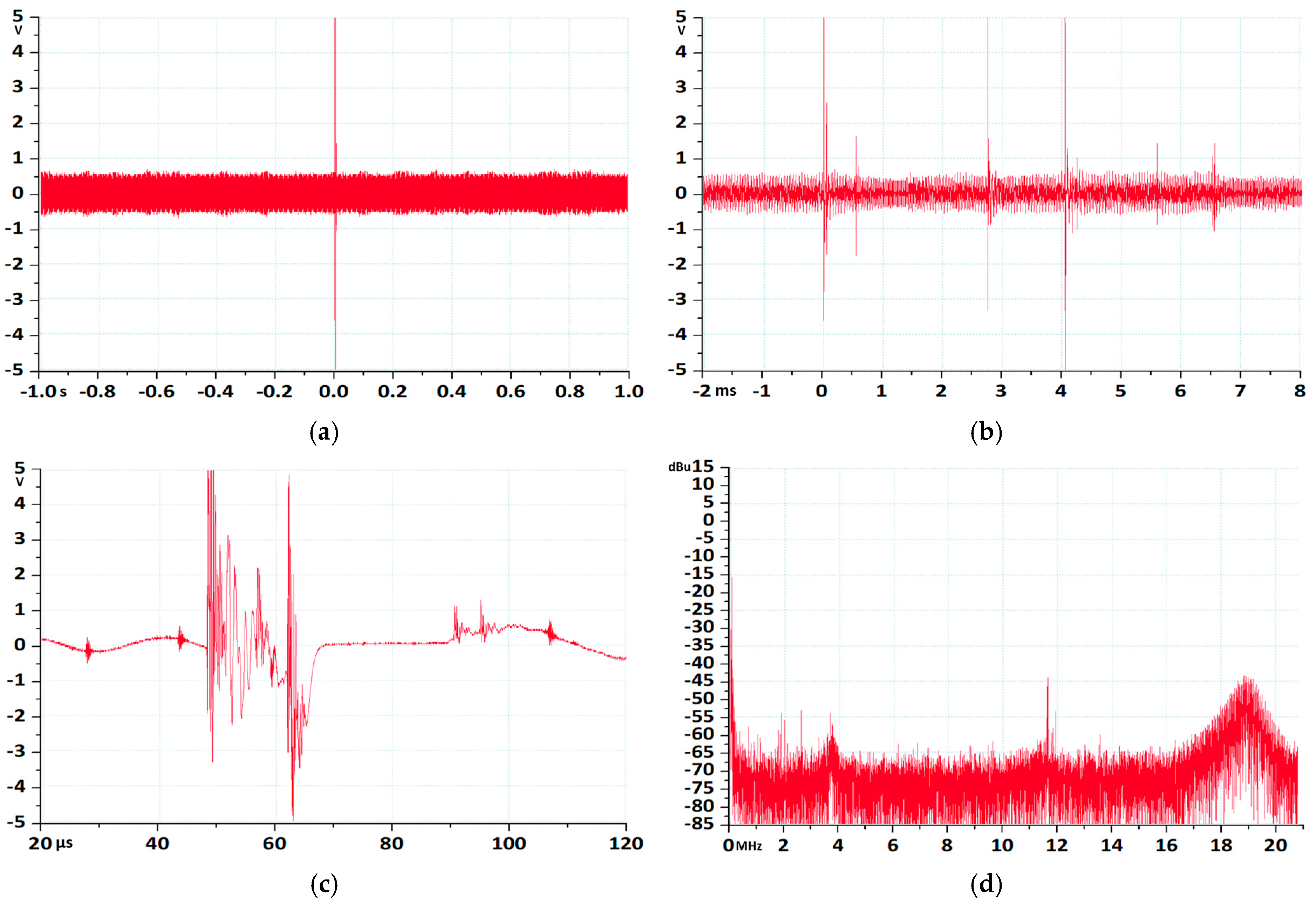Figure 7a–c, defect discharge events appear as sharp transients with amplitudes greater than 2 V, well above the CMV noise level of 1 V.