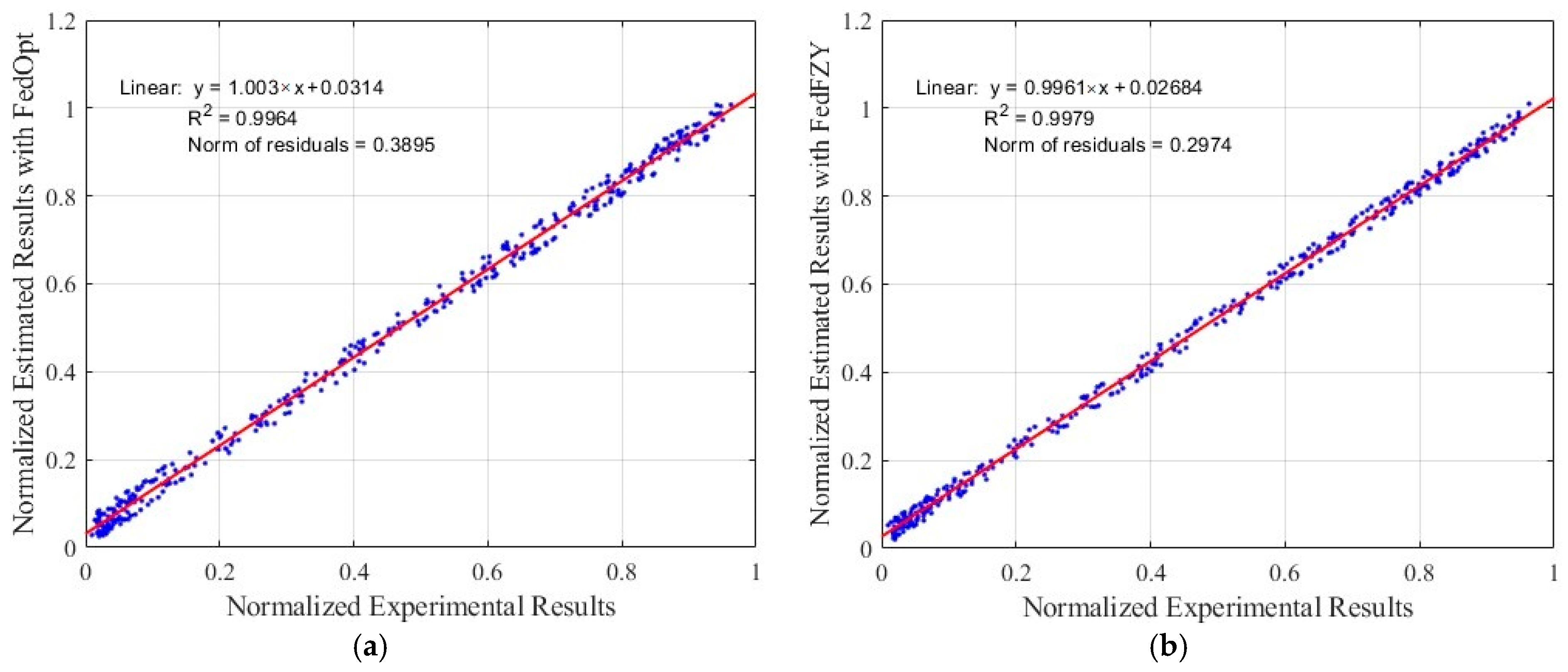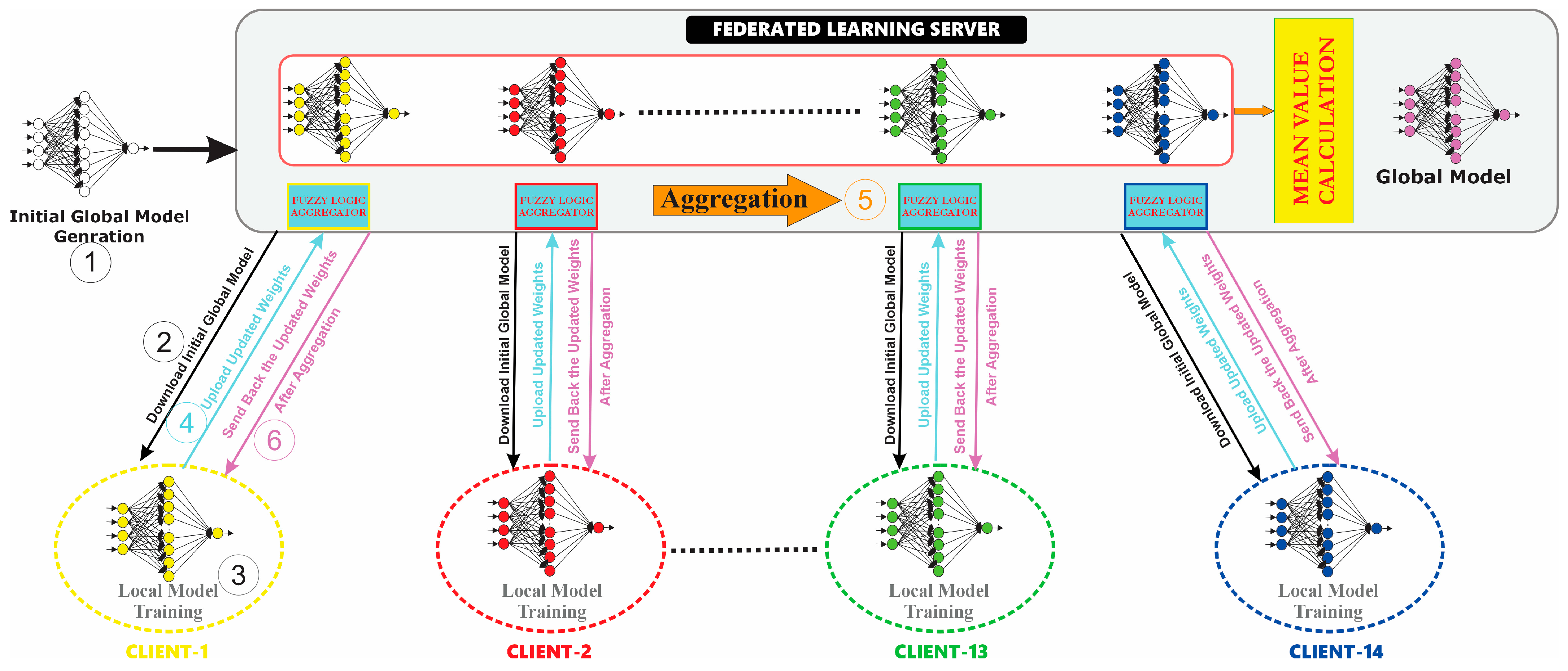 (4) Fuzzy-logic-based federated learning (FedFZY) architecture: In this study, a horizontal federated learning architecture has been used. Horizontal FL, also known as homogeneous FL, represents the scenarios in which the training data of participating clients share the same feature space but have different sample space. The number of clients, , has been selected as 14.