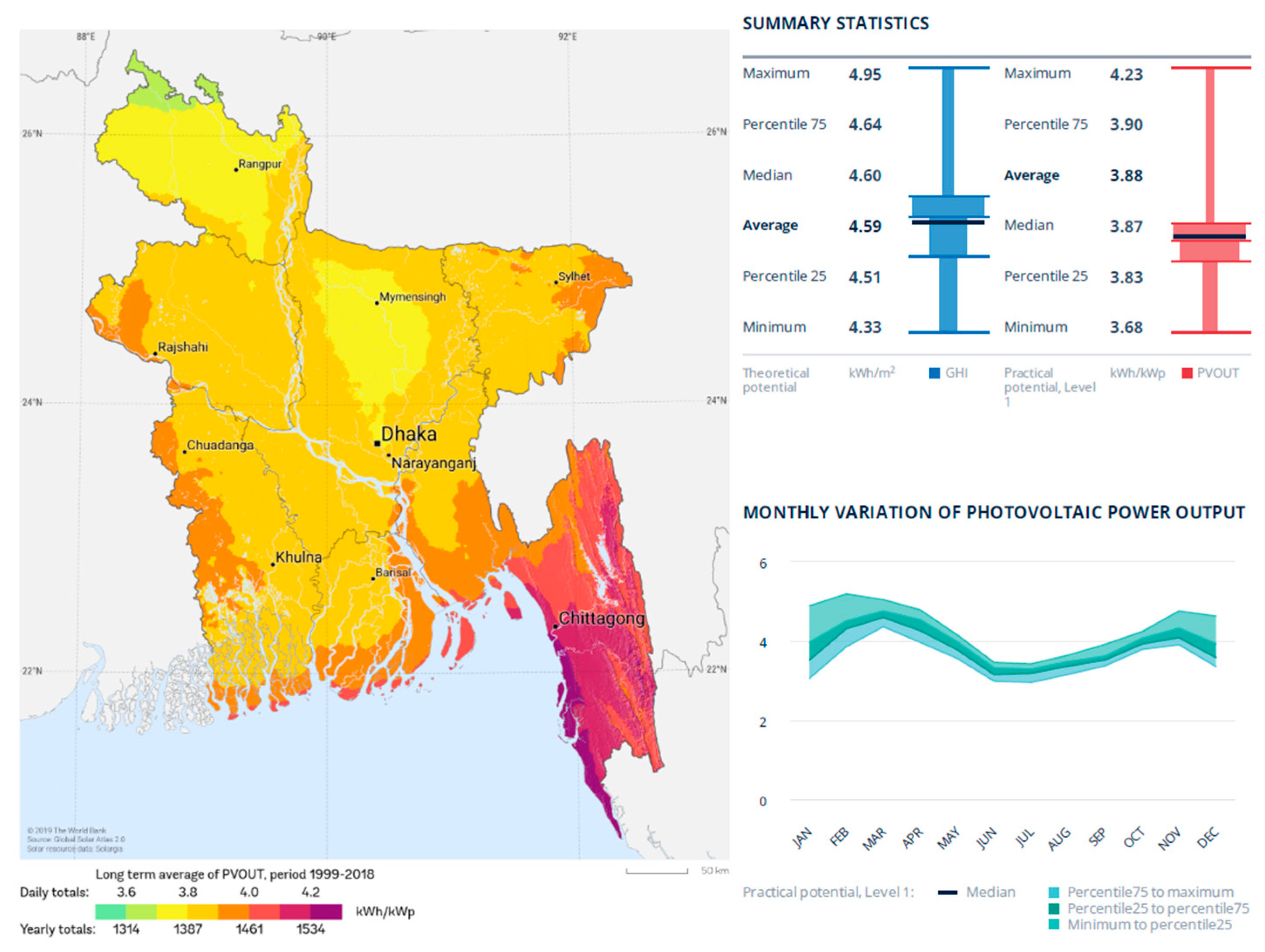 Figure 1, solar PV potential power is shown from a top-down view of Bangladesh. The figure also shows the variation in PV power with respect to the month of the year [