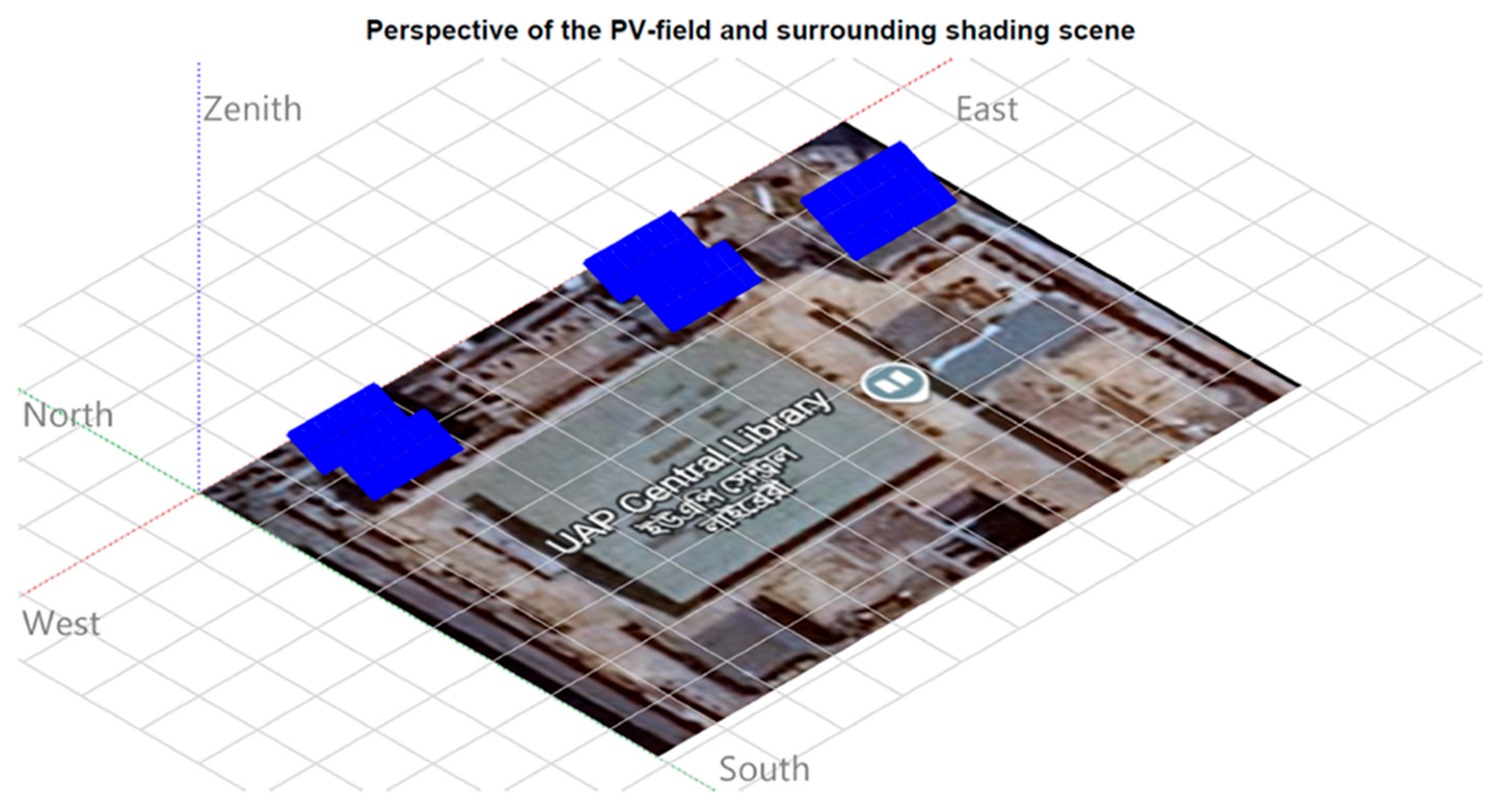 Figure 3 shows the 3D layout of the rooftop PV field at the University of Asia Pacific (UAP) library building. It shows where the panels are placed and how they are shaded. The blue rectangles show the solar PV arrays that are on the roof. The axes show the cardinal directions (north, south, east, and west) and the zenith angle, which makes it easier to understand how to orient the PV panels and how shading might affect them.