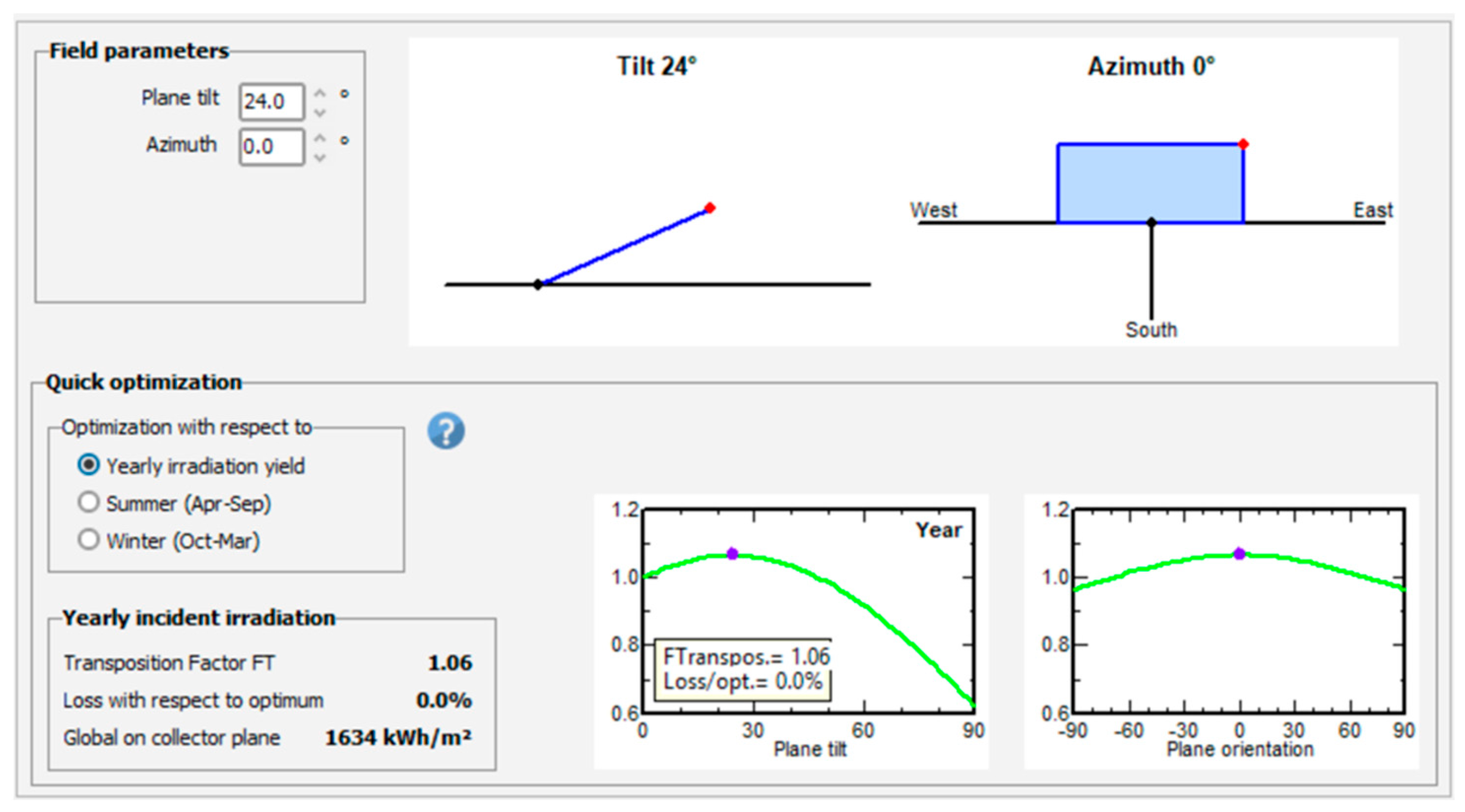2), and transposition factor (FT) (software-recommended). Dynamic angle optimization and tracking systems were not considered, even though they could have increased efficiency.