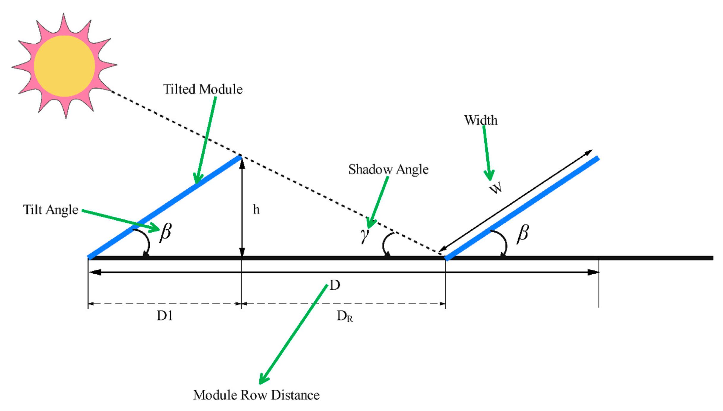 Shadow effects can be reduced by determining the ideal spacing between the panels. The panels should be positioned to avoid shadows from one another during the longest shadow period of the year, which is important for calculating this distance. Finding the optimal tilt angle at which the solar collector receives the most yearly radiation is the first step in this process, which has a significant impact on the PV panel’s efficiency. The height of the panel’s upper edge is then determined using the angle and panel length information from the data sheet, as shown in the following equation: