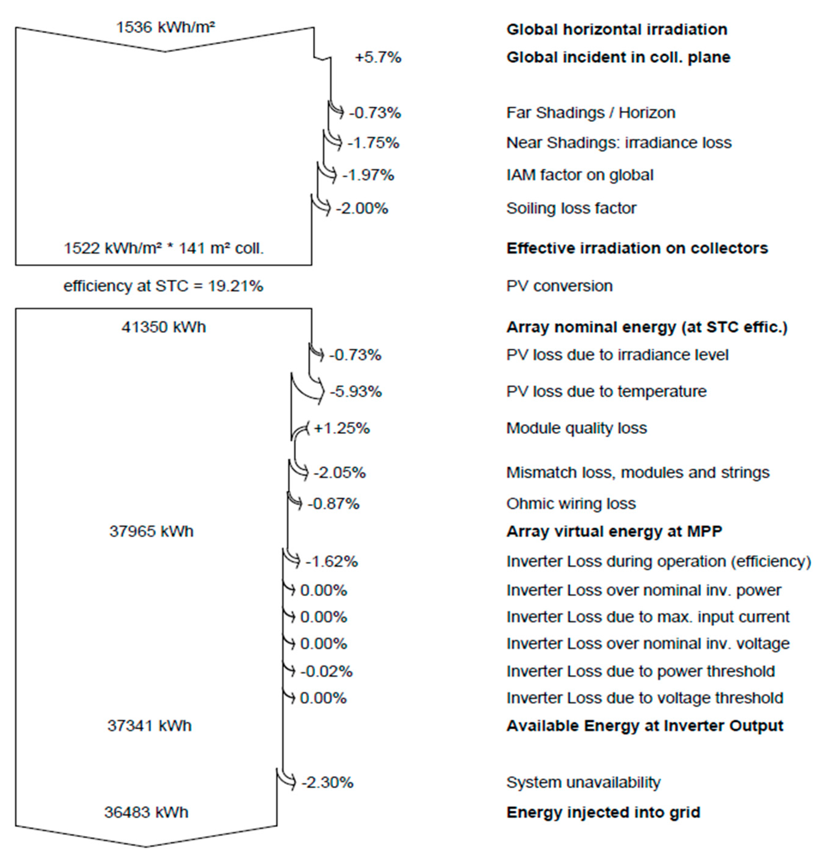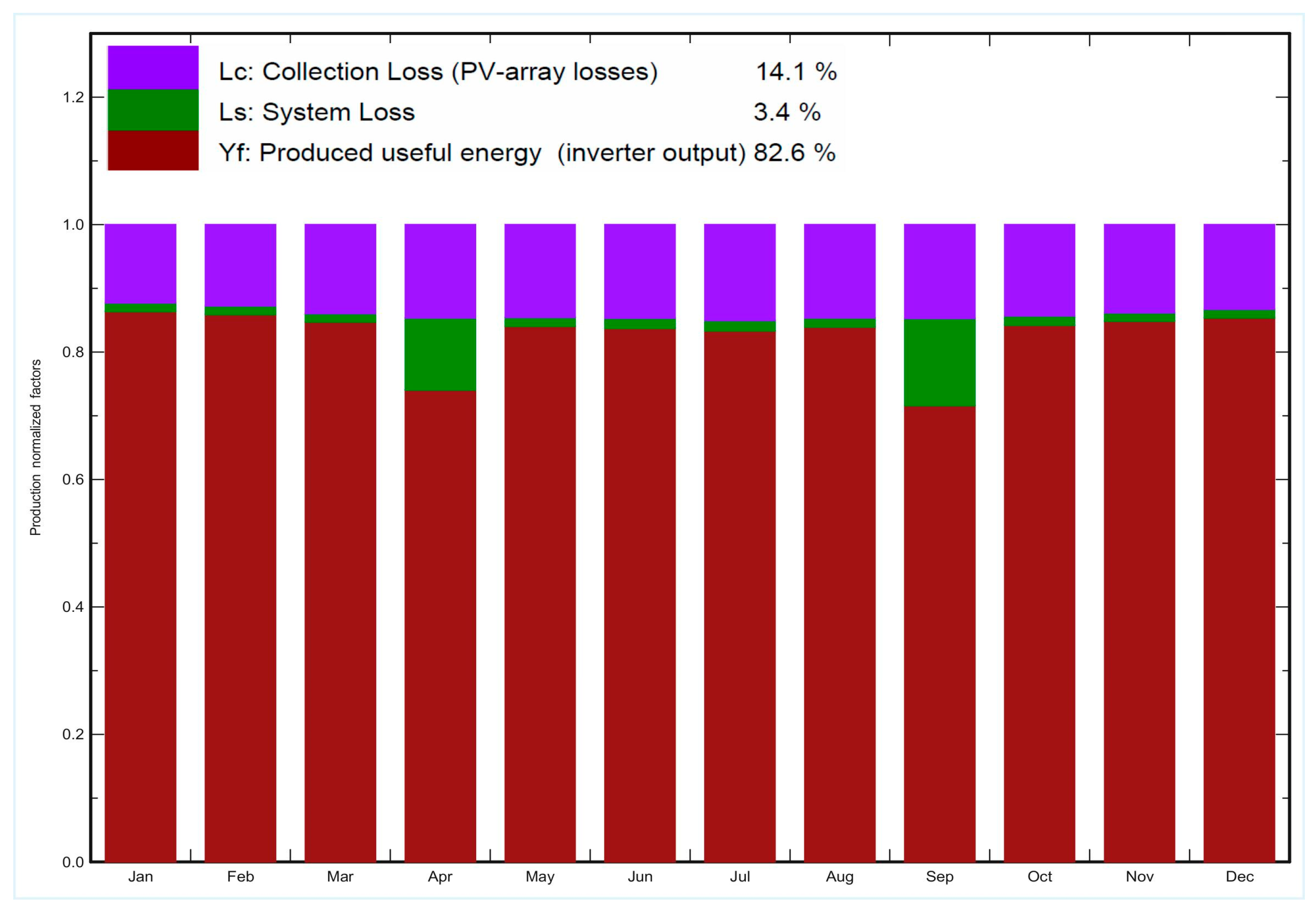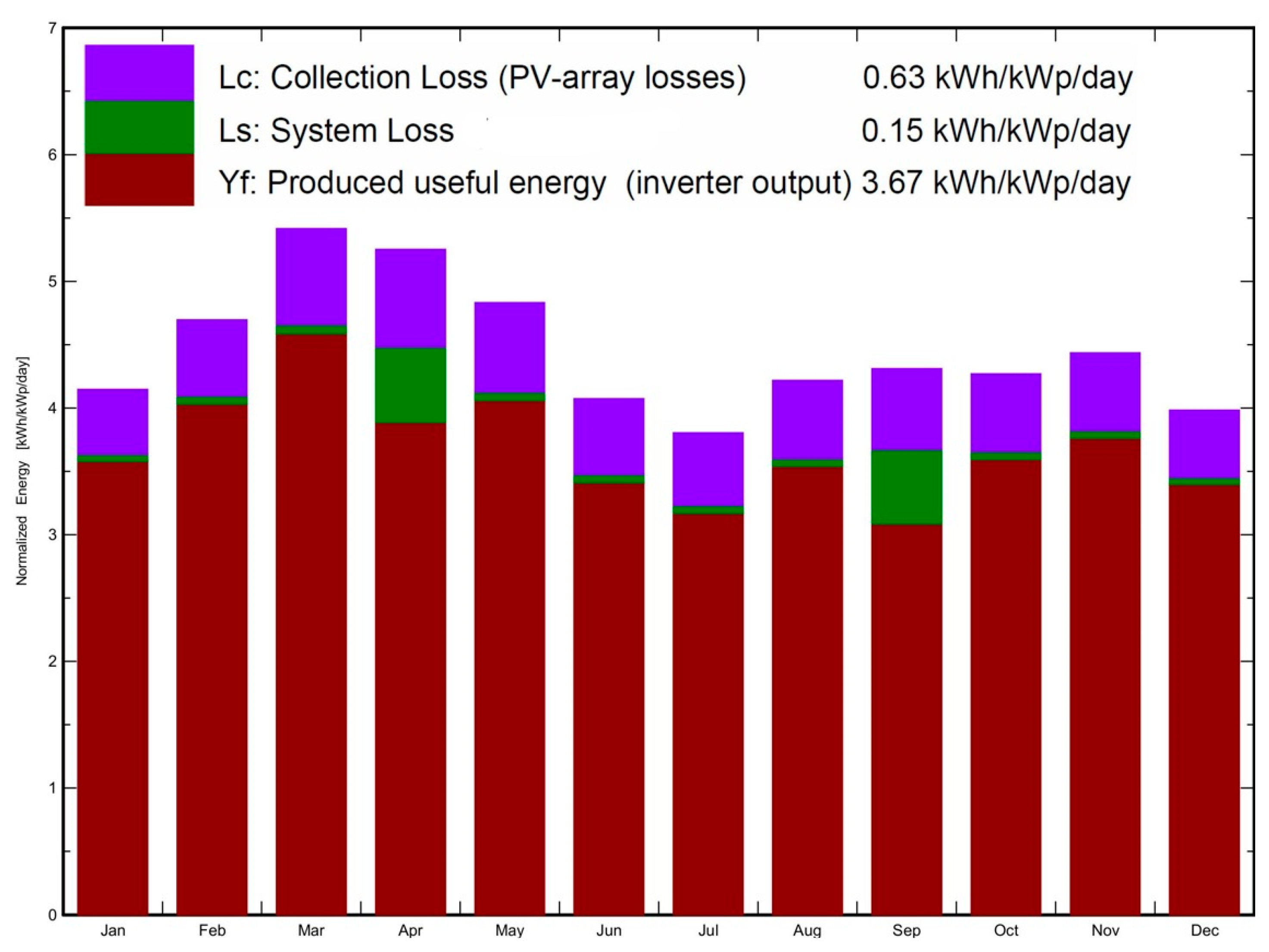 Figure 14 shows the normalized production and loss factors as percentages. The array yield (Ya) is the energy production of the array daily, indicated as nominal power (kWh/kWp/day). The nominal power (kWh/kWp/day) is used to express the system’s daily productive energy, or system yield (Yf). The loss of collection (Lc), which is equal to the difference between the incident reference energy in the plane collector (Yr) and the array yield (Ya), is used to calculate the losses of the array, which include temperature, connection, module quality, error and IAM losses, MPP, shading, dirt, losses of regulation, and all additional inefficiencies. System losses (Ls), which are equivalent to the difference between the array yield (Ya) and the system’s daily usable energy, or system yield (Yf), include inverter loss in grid-connected systems and battery inefficiency in standalone systems.
