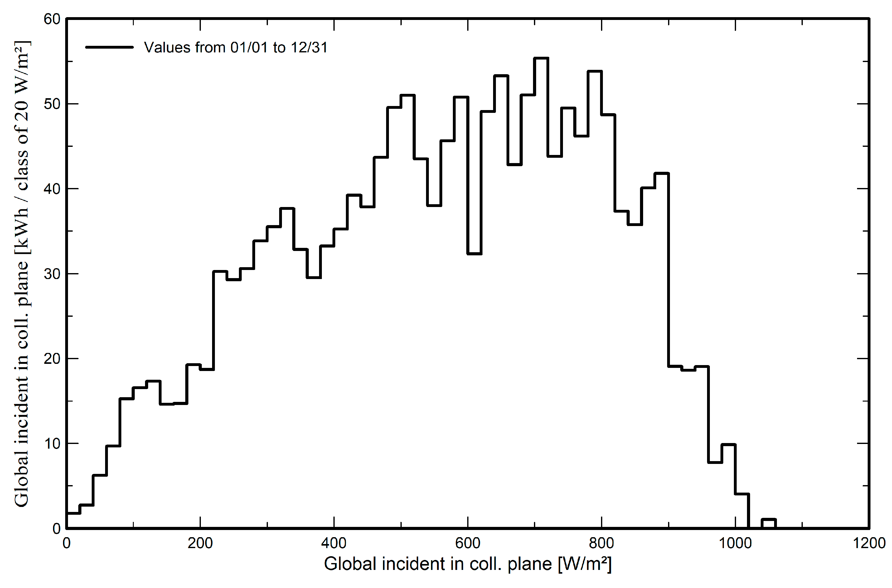 2), the histogram displays the total cumulative incident global energy in the collection plane (kWh/class of 20 W/m