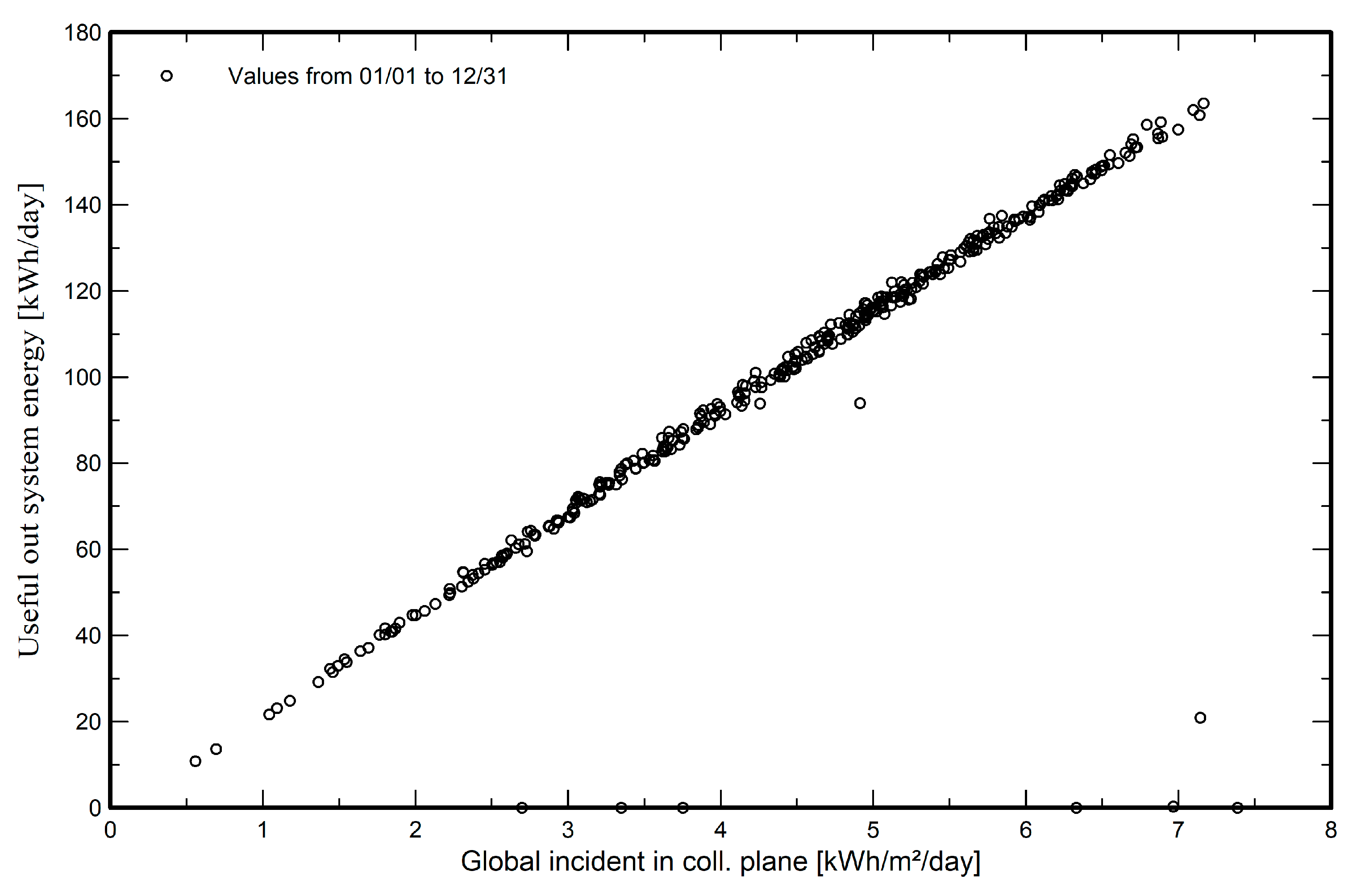 Figure 17 shows the daily input and output diagram. It presents the effective daily energy at the array’s output in kWh/day and the daily irradiance of global incidence in the collection plane in kWh/m
