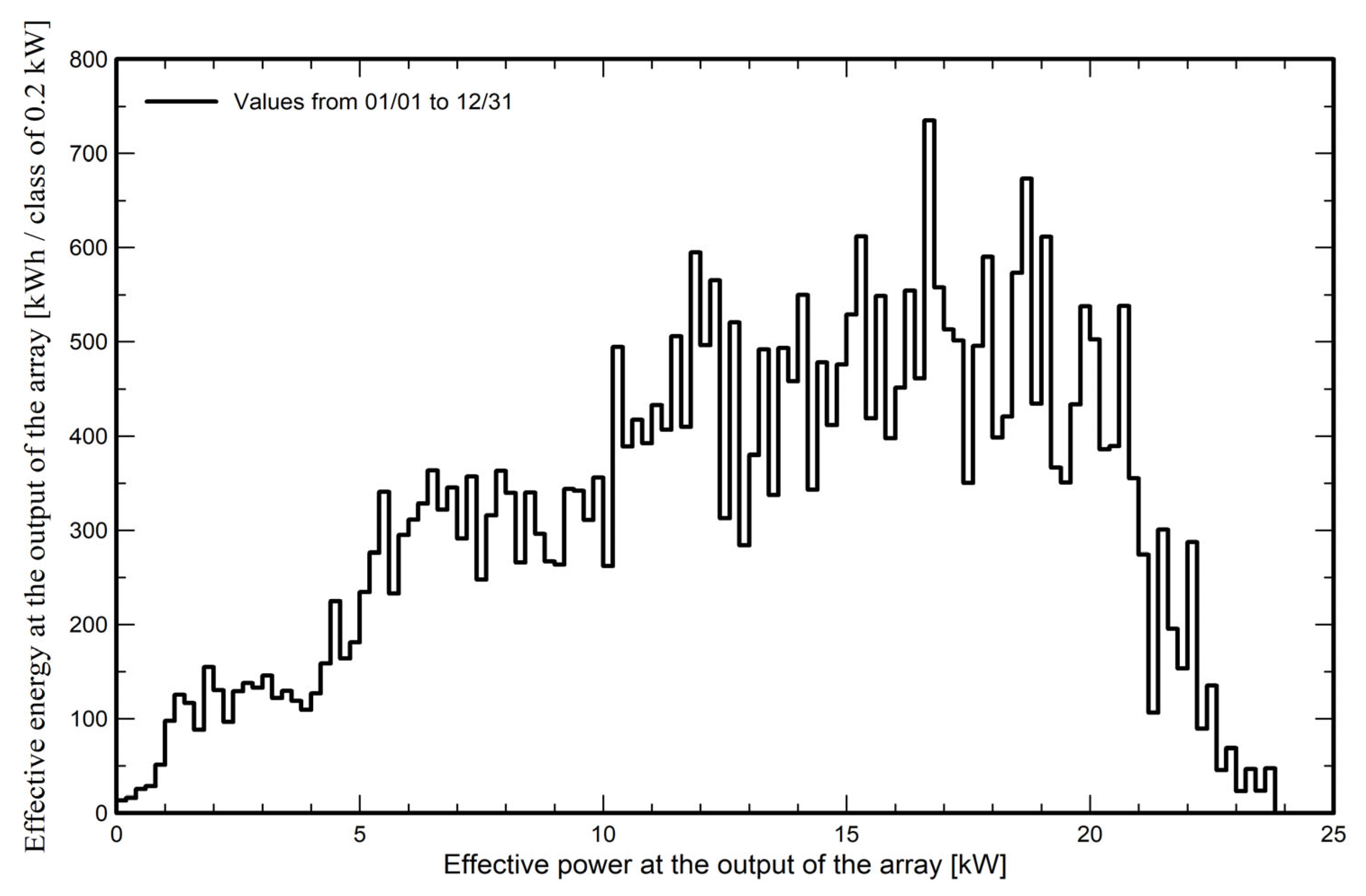 Figure 18 illustrates how a photovoltaic (PV) array’s effective power output is spread over a 12-month period, from 1 January to 31 December. The y-axis displays the corresponding effective energy produced (in kWh) for each class of 0.2 kW, while the