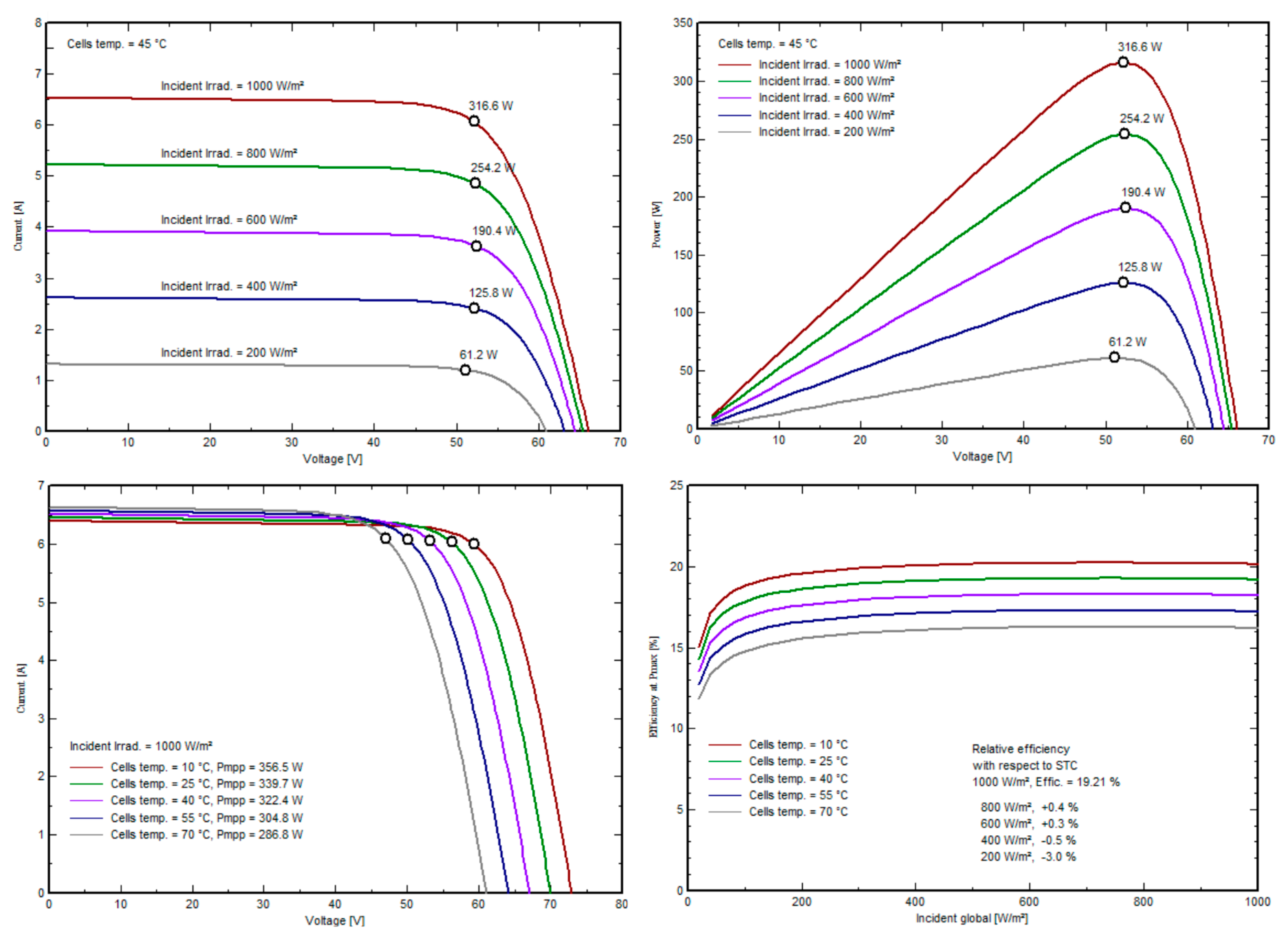 64]. The PV panel’s P-V, I-V, and efficiency curves at different temperatures and solar radiation levels are shown in