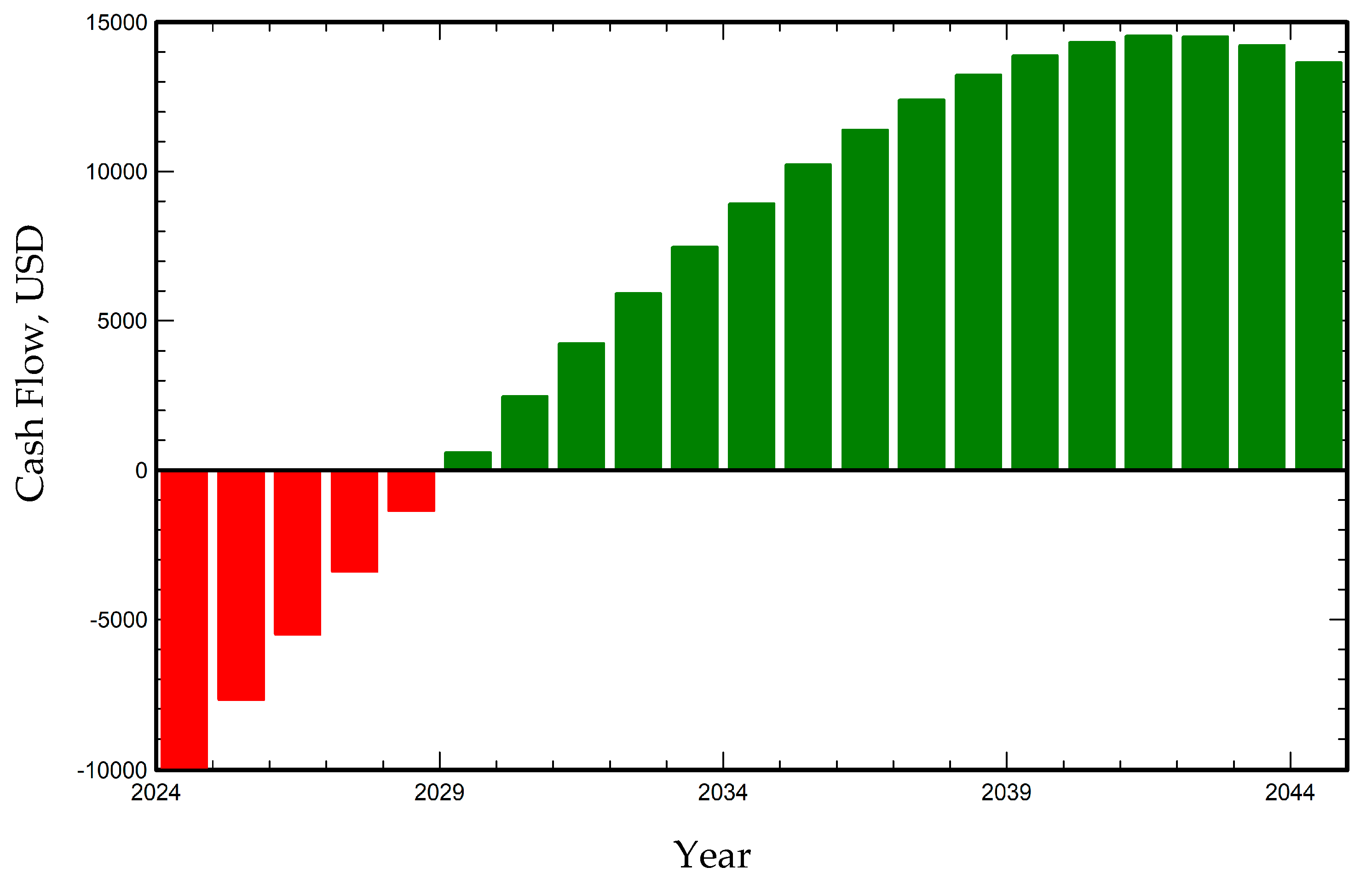 Table 8, installation costs with the PV panel, inverter, and other costs are given, along with operating costs, which are not regularly connected to the whole system, such as repair, cleaning, security, and so on. The economic viability of solar is evident in the levelized cost of energy, which is 0.061 USD/kWh. This cost is much lower than the average cost of electricity generation in Bangladesh from fossil fuels. Even without significant subsidies, small- to medium-sized rooftop and grid-tied PV systems can quickly become profitable, with a payback period of 4.7 years.