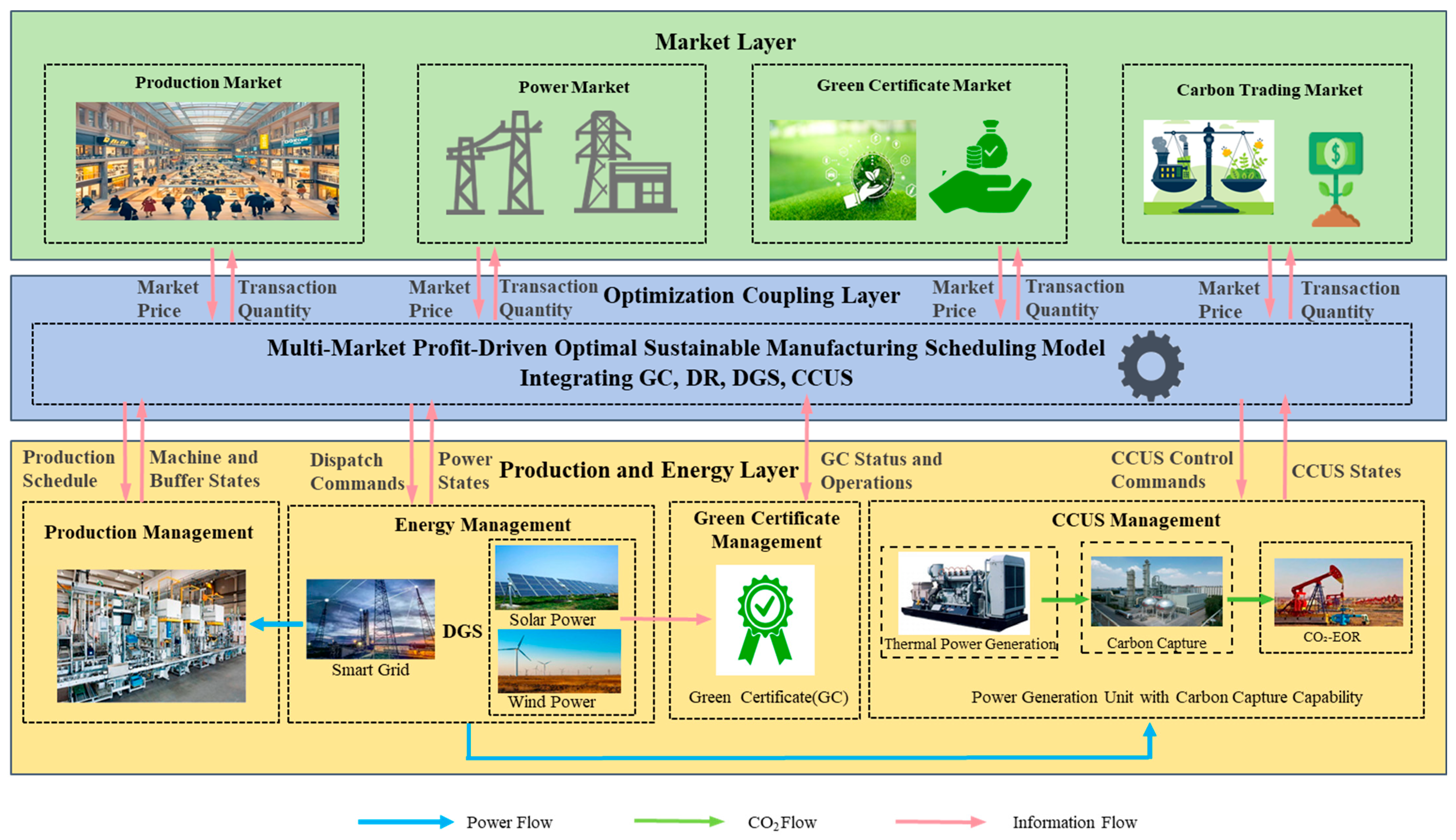 - Inadequate Holistic Assessment: Current research lacks systematic quantification of the dynamic trade-offs between economic gains and environmental impacts in sustainable manufacturing systems, particularly in scenarios involving multi-market participation. Furthermore, existing evaluations fail to capture the synergistic effects of integrating manufacturing scheduling, GC, DR, DGS, CCUS technologies on both profitability and emission reduction.