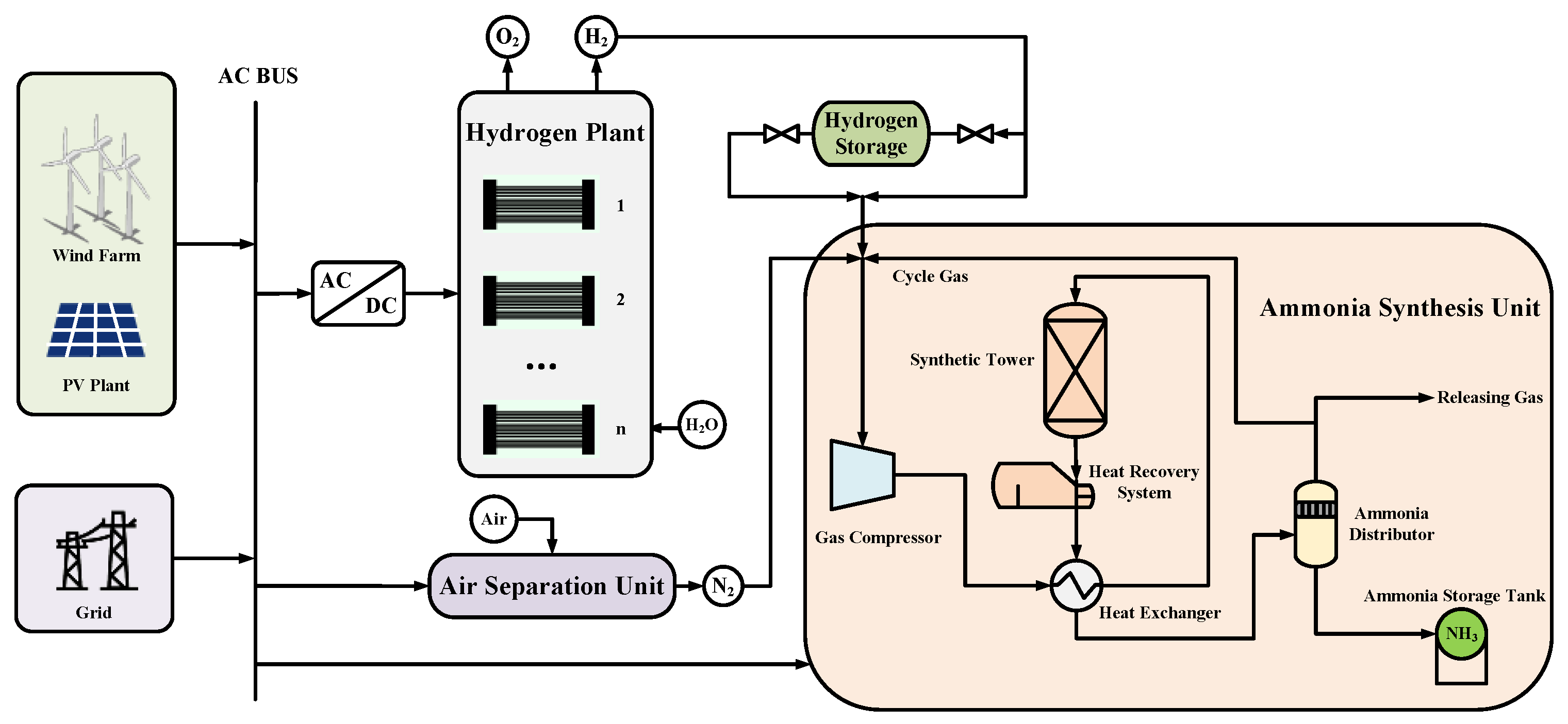 - Yu, Z.; Lin, J.; Liu, F.; Li, J.; Zhao, Y.; Song, Y. Optimal Sizing of Isolated Renewable Power Systems with Ammonia Synthesis: Model and Solution Approach. IEEE Trans. Power Syst. 2024, 39, 6372–6385. [Google Scholar] [CrossRef]