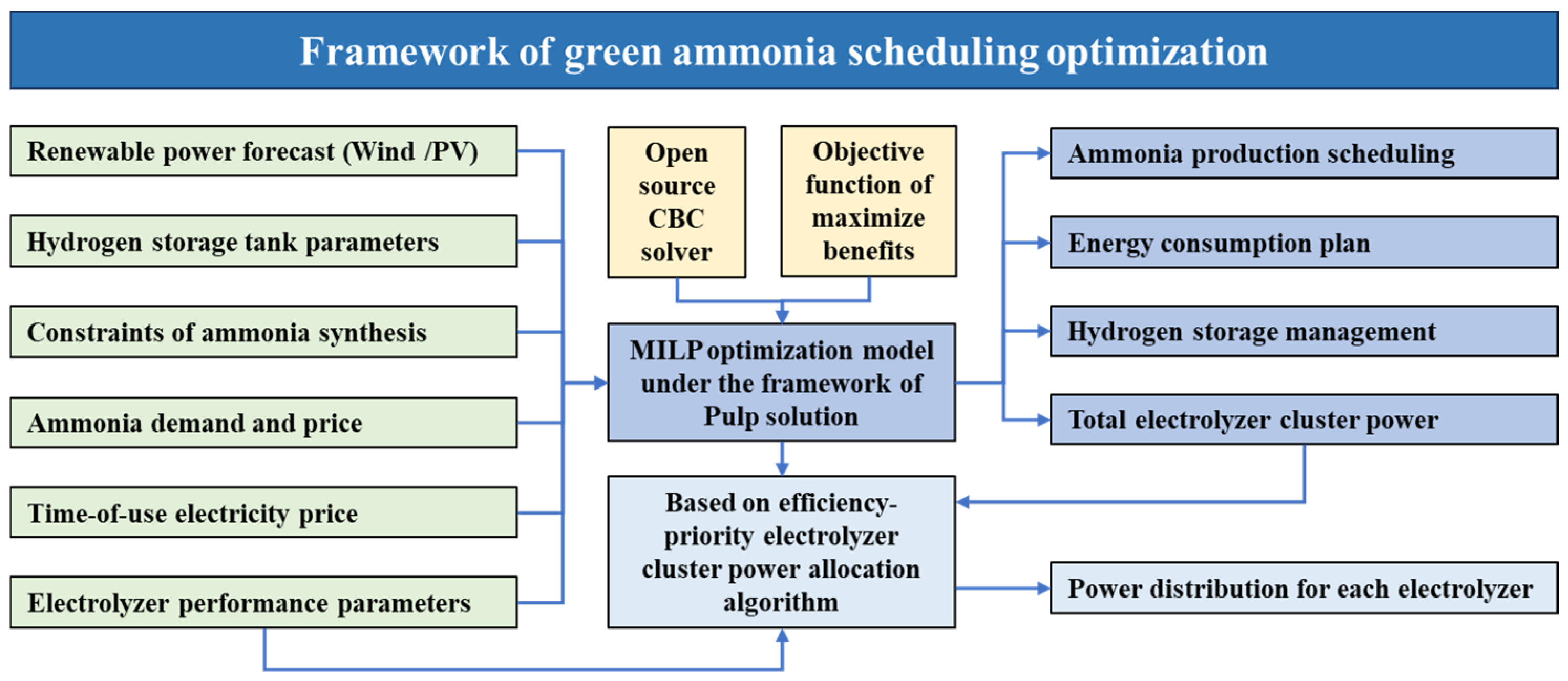 - A High-Fidelity Multi-Timescale MILP Dispatch Model: An integrated scheduling framework is developed, including the dynamic interactions among renewable energy generation, electrolytic cell, hydrogen storage and Haber–Bosch process, as well as the stability and ramping constraints of ammonia production. The model aims to realize the coordinated scheduling of each section in the wind–solar hydrogen production synthetic ammonia system, and maximize the economic profit while enhancing the stability of the synthetic ammonia production process.