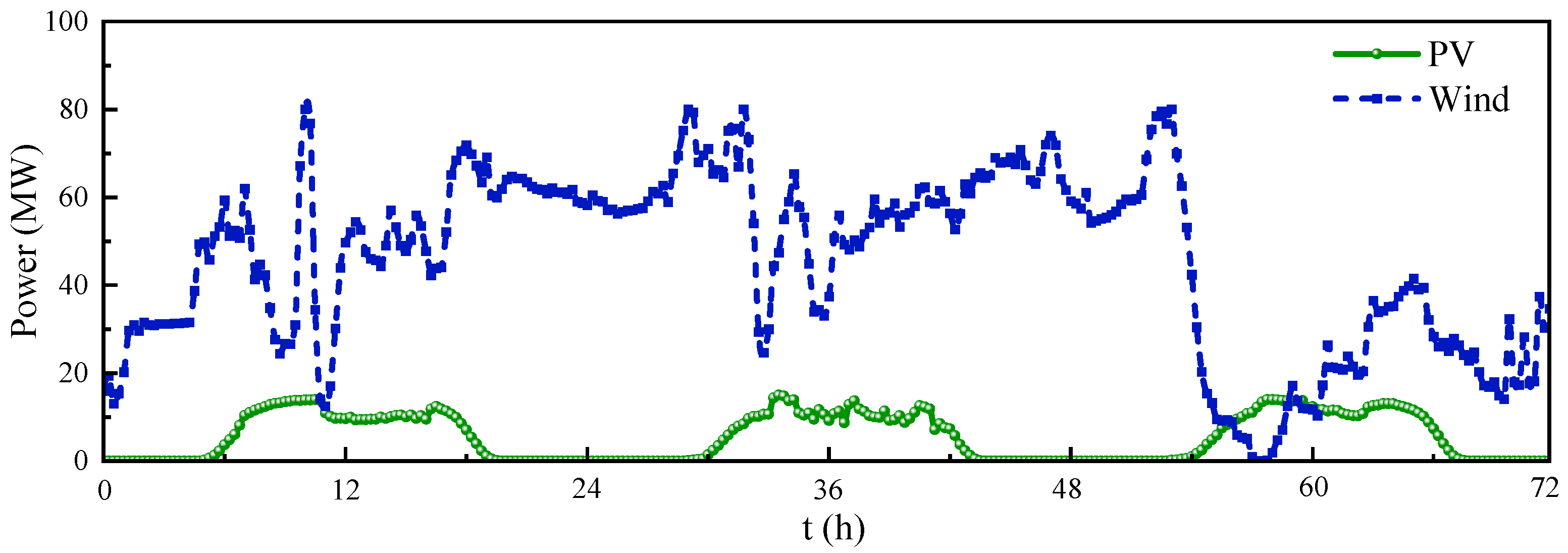 - A Rigorous Multi-Dimensional Performance Validation: The proposed framework is rigorously validated via a 72-h case study using real wind–solar data. A comparative analysis against two benchmarks—a rigid “Steady-State Scheme” and a volatile “Following Scheme”—across multiple key performance indicators quantitatively demonstrates the superiority of the “Balanced Scheme” in balancing economic efficiency, renewable integration, and operational robustness.