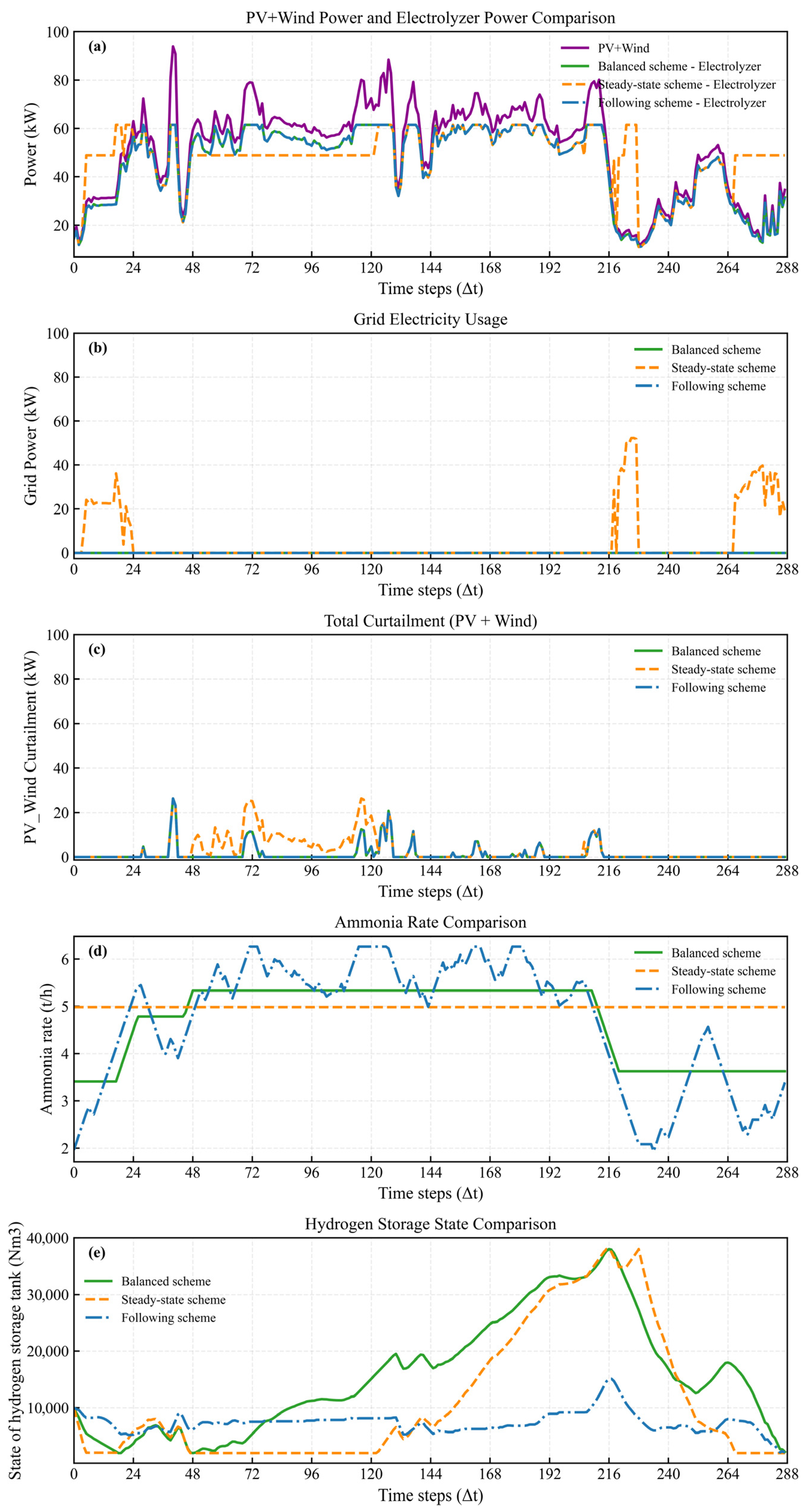 - Balanced Scheme (Scheme A): achieves comprehensive coordination between renewable energy utilization and system load stability. All four sub-objectives in the composite optimization—ammonia revenue, electricity cost, load fluctuation penalty, and curtailment penalty—are considered, and the weight coefficients are set to [1, 1, 1, 1]. The reason for the equal weight of 1 is that all sub-goals are represented by the corresponding monetary unit (CNY) to ensure that each project contributes to the total cost based on its inherent economic impact, without arbitrary scaling.