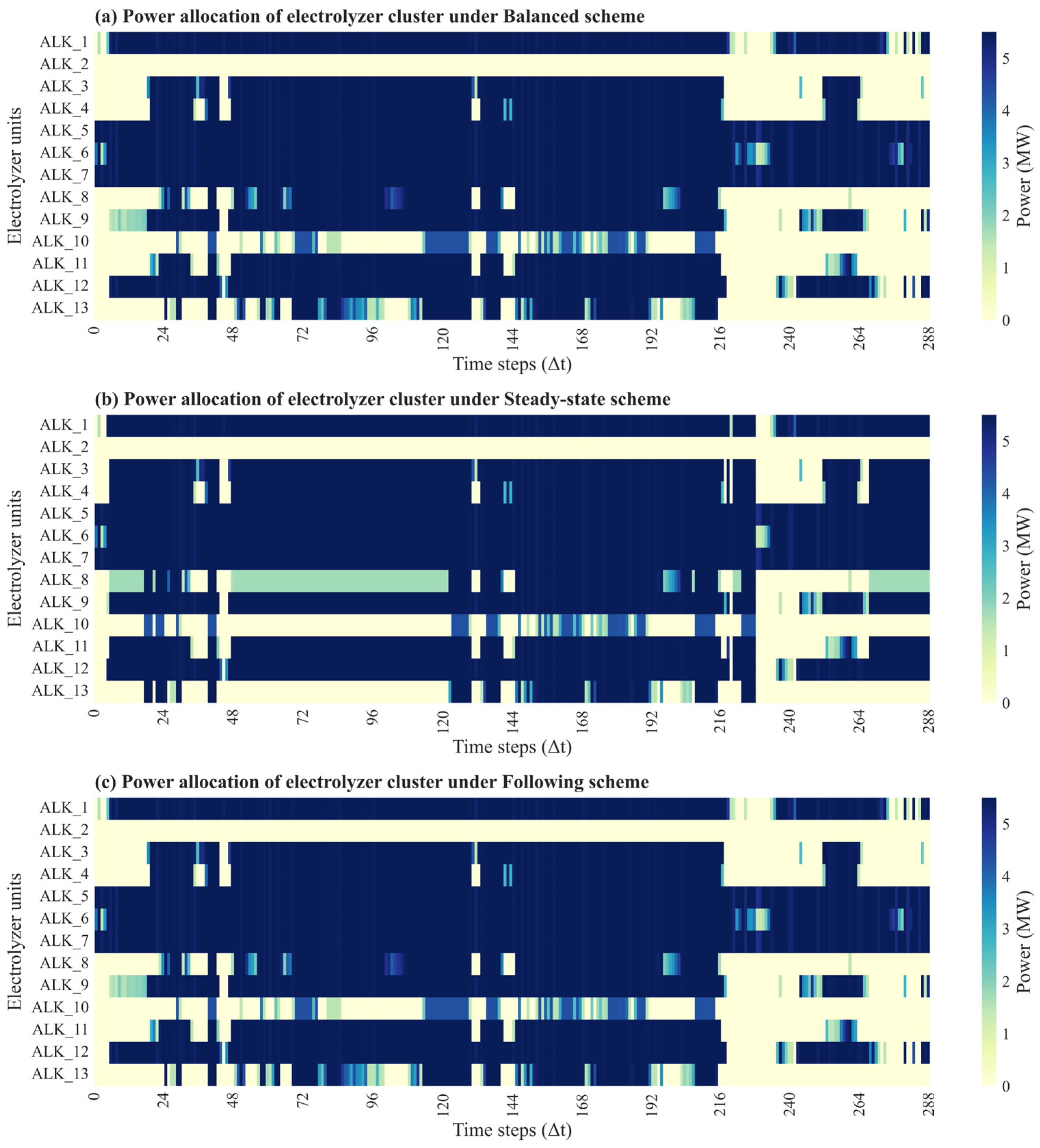 - The efficiency-priority power allocation strategy for electrolyzers effectively prevents overloading of some units and enhances the overall energy efficiency and operational stability of the hydrogen production system cluster.
