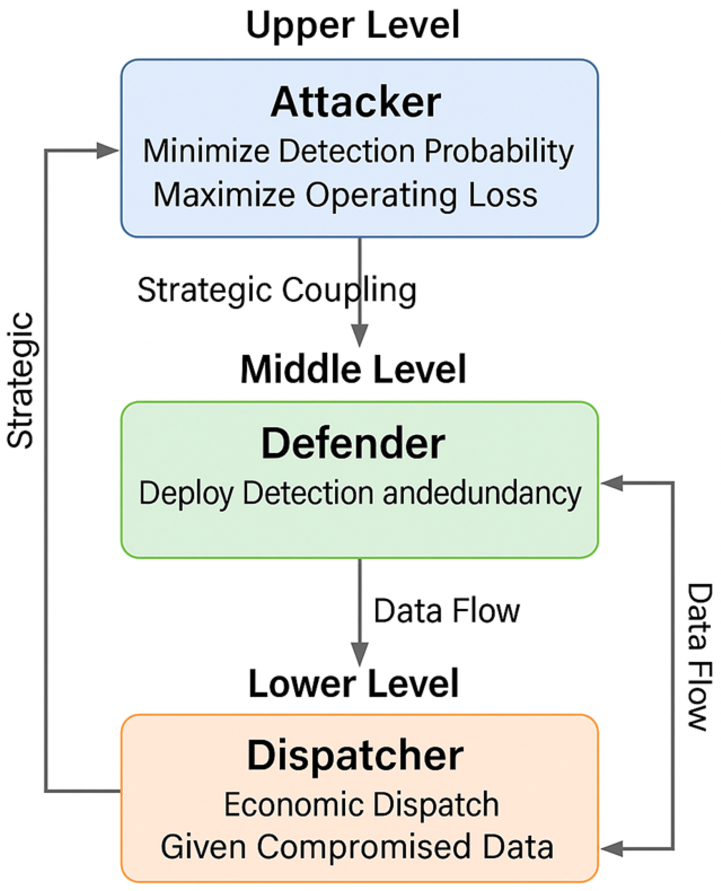 Figure 1 illustrates the conceptual tri-level interaction among attacker, defender, and dispatcher; the mathematical formulation in model (