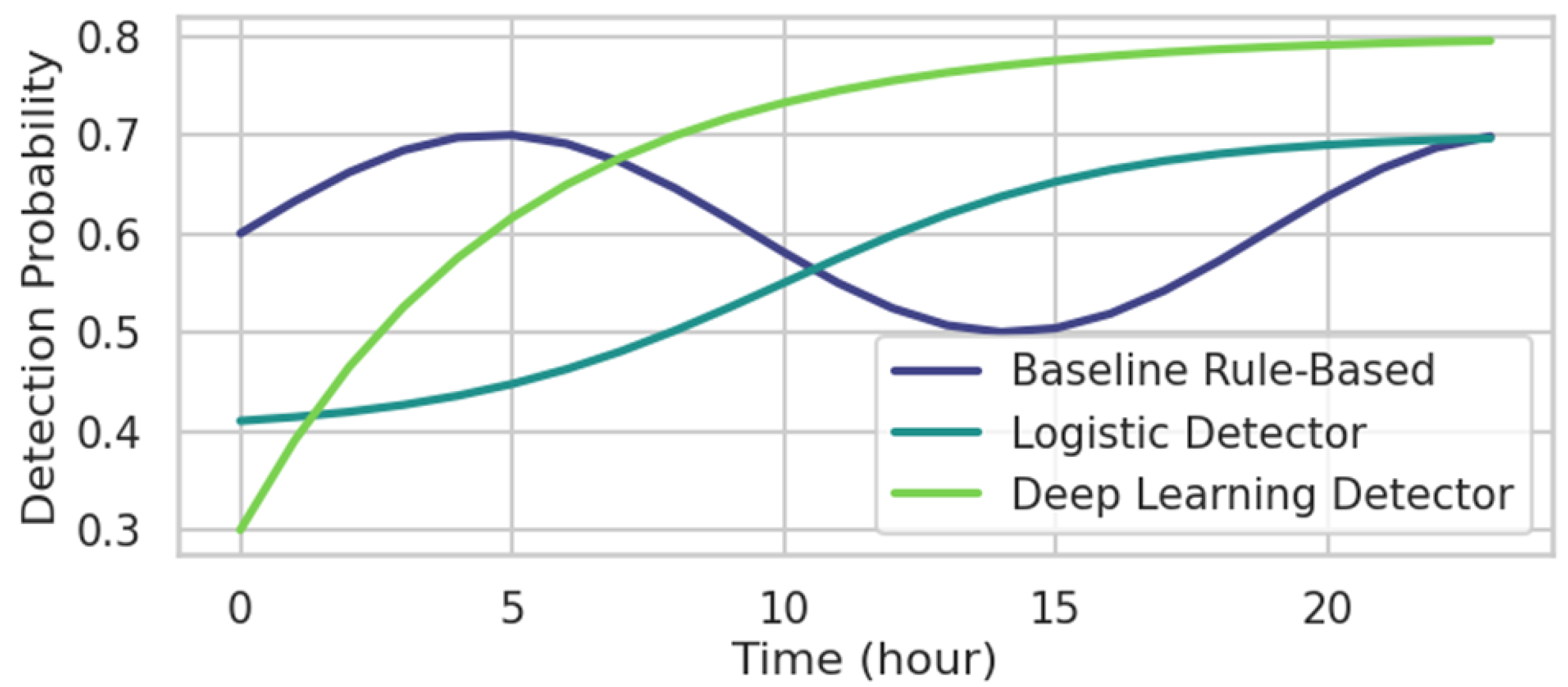 Figure 6 compares the temporal evolution of cyberattack detection probabilities under three defense strategies—rule-based baseline, logistic statistical detection, and deep learning-based adaptive detection. Over a 24 h horizon, the baseline curve fluctuates around 0.6 with minor oscillations, reflecting steady but limited static detection. The logistic model shows a delayed but accelerating response, with detection probability rising from 0.4 at hour 0 to approximately 0.7 after hour 18 as the statistical learning mechanism adapts. The deep learning detector achieves rapid convergence, reaching 0.8 by hour 10 and saturating near 0.9 by hour 20. The divergence among these trajectories quantifies the time-value of intelligence in defensive algorithms: advanced models achieve earlier stabilization, reducing undetected intrusion exposure. The plot confirms that time-dependent learning embedded within the defender’s mid-level optimization significantly enhances resilience against evolving cyber threats.