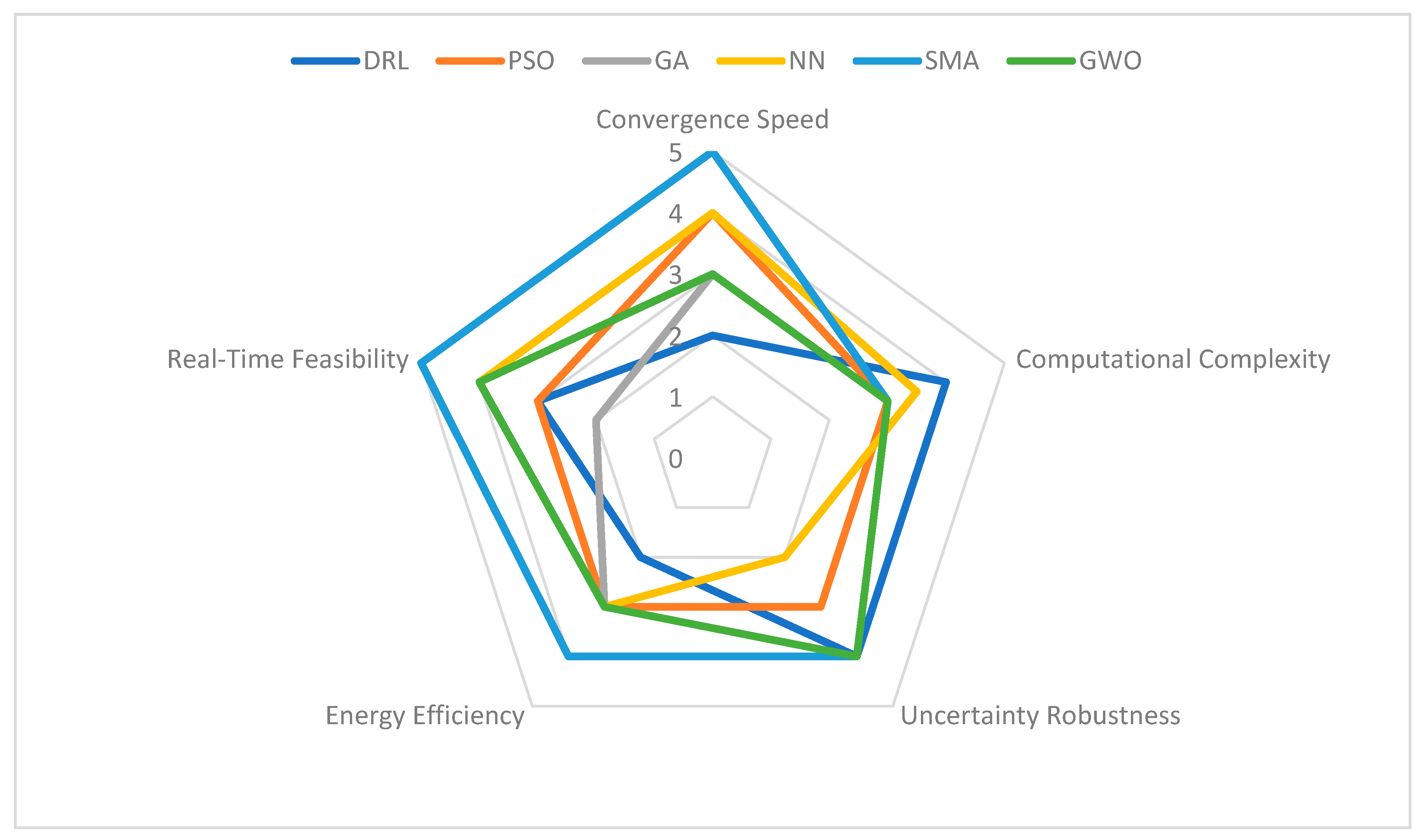 - Hybrid approaches outperform single-method algorithms, especially combinations such as PSO-GA, DRL-PSO, or NN-GWO, which leverage complementary strengths in exploration, prediction, and policy adaptation.