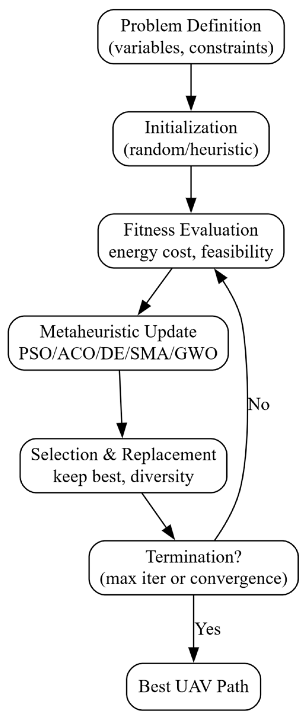 | “Hybrid Discrete Grey Wolf Optimizer Algorithm for Multi-UAV Path Planning” [27] | To minimize mission time in multi-UAV surveillance missions under stringent energy constraints. | Hybrid Discrete Grey Wolf Optimizer (HDGWO) with discrete update operators and two-opt local search enhancements. | Effectively solved the multi-UAV energy-constrained routing problem, with improved convergence and solution quality over the standard GWO approach A Novel Hybrid Discrete Grey Wolf Optimizer Algorithm for Multi-UAV Path Planning |