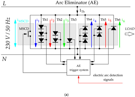 Figure 1a shows that the AE hybrid eliminator consists of semiconductor thyristor branches (Th1–Th6) and a mechanical short-circuiting switch (MSCD) connected in parallel with them. The thyristors connected in parallel conduct current for the positive half-cycle (Th1, Th2, Th3) and the negative half-cycle (Th4, Th5, Th6). Each semiconductor branch contains an appropriate number of thyristors connected in series, allowing for the sequential takeover of the fault current and the gradual reduction in arc voltage below the level required to sustain the arc until the MSCD switch contacts are closed.