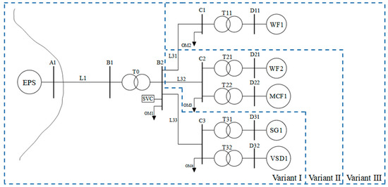 A linear model of the test system was developed in three variants (Variants I, II, and III), as shown in Figure 2. Variant I includes a synchronous generator (SG1) and an industrial load (VSD1). Variant II contains all the components of Variant I, extended by an offshore wind farm (WF2) and a marine current farm (MCF1). Variant III represents the complete configuration, incorporating all elements from Variants I and II, and further expanded by an additional offshore wind farm (WF1).