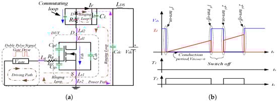 The circuit of the DPT is shown in Figure 2a. This is utilized in testing the switching behaviors of the switch devices during the turn-on and turn-off transitions [33,34,35]. The DPT comprises the power supply ( V d c ), the gate drive circuitry, a supply voltage stabilizing capacitor during the test, the load inductor, and the free-wheeling diode. Figure 2b shows the basic ideal waveform for drain–current and drain–source voltage during the transition events.