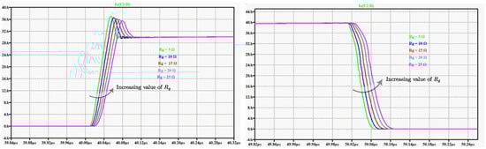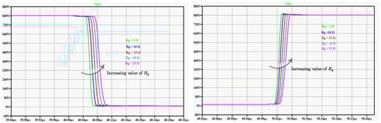 Table 3 below shows a summary of the effects associated with increasing and decreasing the value of gate resistance R g and the various influences on different parameters of typical SiC and Si devices during the turn-on (turn-off) switching transitions. As mentioned previously, it can be clearly deduced that when the value of R g is raised, the gate voltage transitions slow down, consequently increasing the turn-on (turn-off) transition time ( t o n , t o f f ), ultimately leading to increased switching energy loss ( E o n , E o f f ). The ultimate result is lowered current and voltage slew rates ( d i / d t , d v / d t ), implying reduced voltage overshoots, reduced peak and recovery currents, and reduced EMI noise, which provides a safer, smoother switching process, though at the expense of efficiency. Notably, the converse is true for a smaller R g .
