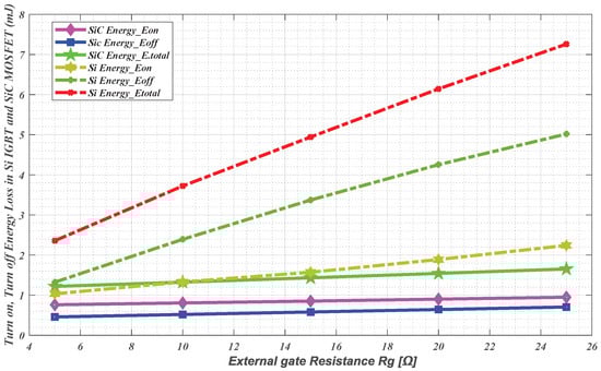 It is noted that a large value of R g prolongs the turn-on delay and current rise time but does not change the gate signal, as can be seen in Figure 3 and Figure 4. From these two figures, the device has been characterized under different operating conditions with V d c = 800 V and a varied gate resistance R g . Specifically, the transient have been captured at R g = 5   Ω , 10   Ω , 15   Ω , 20   Ω , and 25   Ω . Furthermore, as the value of R g is increased, the amount of energy lost increases. The gate resistance has a strong influence on the turn-on and turn-off energy dissipation. Smaller gate resistance implies a lower switching loss, though, on the other hand, very small gate resistance increases the device loss and current-voltage ridging. The summation of the energy loss indicates that the energy loss is proportional to the value of the gate resistance. Figure 5 points out that when the value of R g = 5   Ω , the turn-on energy loss is 0.76 mJ and 1.03 mJ, and the turn-off energy loss is 0.45 mJ and 1.32 mJ for SiC and Si, respectively. Increasing the R g linearly increases the turn-on energy loss to 0.95 mJ and 2.24 mJ, while the turn-off energy increases to 0.70 mJ and 5.02 mJ for SiC and Si, respectively. A clear indication that the turn-off energy, especially in the Si device, is significantly high due to the tail current associated with its turn-off process, when the value of gate resistance R g is high. The other values of turn-on (turn-off) energy loss in the range of the different resistances are shown in Table 2.