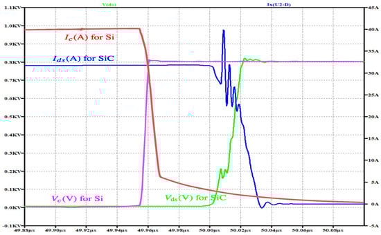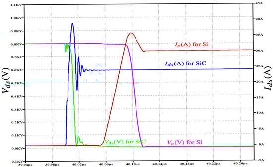 Figure 6 and Figure 7 illustrate the quantified turn-on and turn-off switching behavior of the Si and SiC devices. To have a better visibility of this illustration, the two waveforms are placed on the same scale. These devices have been tested with input constants, which are the dc-link voltage source V d s = 800 V , the output current, which is modeled as a constant current source I d s , and the gate signal V g a t e , which flips between −4 V and V g s . In Figure 6, the SiC demonstrates a significantly faster voltage drop during turn-on, with a clean transition and minimal oscillations, in comparison with the Si device dynamic curve, which exhibits a slower voltage decrease and a delayed current rise due to higher gate resistance and minority carrier effects. The said delay contributes to significant switching losses in Si compared to SiC devices. Conversely, Figure 7 shows the turn-off dynamic characteristic, in which the SiC MOSFET shows a great performance against the Si IGBT. This is because the SiC exhibits rapid voltage recovery with minimal ringing, whereas the Si shows a pronounced tail current, which further increases turn-off switching losses. Generally, from the two figures, it is clearly observed that the SiC device showcases superior switching performances with reduced energy loss and enhanced dynamic switching characteristics, making it superior for high-efficiency and high-frequency operations.