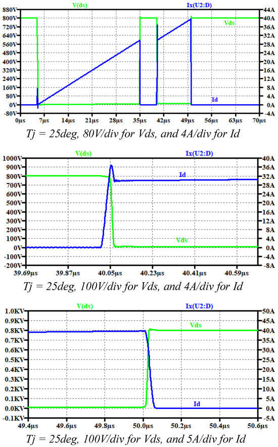To ensure the simulation results accurately reflect the real environment setup and switching transient, stray inductance was included in the model. The PCB power loop lumped inductance was taken as 10 nH, and the gate loop parasitic inductance was 2 nH. Furthermore, to account for the discrete device package parasitic, the simulation included drain, source, and gate inductance of 5 nH, 2 nH, and 10 nH, respectively. The drain–source parasitic capacitance C d s , gate–source parasitic capacitance C g s , and gate–drain parasitic capacitance C g d used in the simulations were 84.5 pF, 1122.5 pF, and 7.5 pF, respectively.