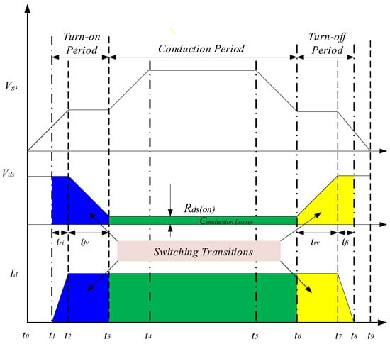 Figure 10 shows the ideal waveform of the devices during the switching transitions. t r i is the current rise time, t f v is the voltage fall time, t t v is the voltage rise time, and t f i is the current fall time. The region between the time t 1 t 3 shows the turn-on transition period, and t 6 t 8 shows the turn-off switching transition. t 3 t 6 is the period when the switch is on, where the drain–source voltage V d s ( o n ) is minimum and the drain current I d is maximum. This region is signified by the conduction losses.