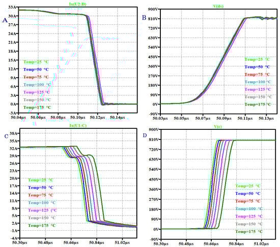 Figure 11. Analytical switching waveforms showing turn-off characteristics of Si and SiC MOSFET with temperature variations. (A) SiC turn-off current, (B) SiC turn-off voltage, (C) Si turn-off current, (D) Si turn-off voltage.