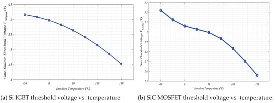 Figure 12. Threshold voltage variation with temperature for (a) Si IGBT and (b) SiC MOSFET.