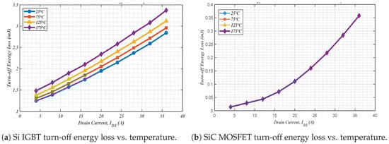 With a dc-link voltage of 800 V, the switching energy loss of Si IGBT and SiC MOSFET under different junction temperatures was computed and illustrated in Figure 13a,b, respectively. It was observed that there is a linear trend across all temperatures. In higher currents, a great energy is stored in the device’s magnetic components and capacitance, which is dissipated, translating to higher energy loss. Since there is a long current tail in Si IGBT during the turn-off process, the energy dissipation is higher. As observed, at 4A, 1.2 mJ is lost at 25   C , with an energy loss of 3.3 mJ lost at 175   C in the Si device. Comparatively, the energy loss in the SiC device increases with an increase in drain current; however, a slight variation was observed with temperature variations, as shown in Table 6.
