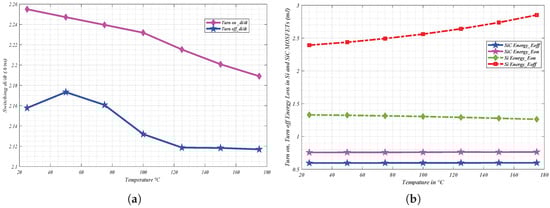 Figure 13. Turn-off energy loss variation with temperature for (a) Si IGBT and (b) SiC MOSFET.
