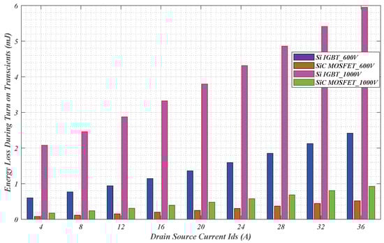 Figure 15. Comparison analysis of turn-on energy loss of Si and SiC MOSFETs at 600 V and 1000 V operating voltages.