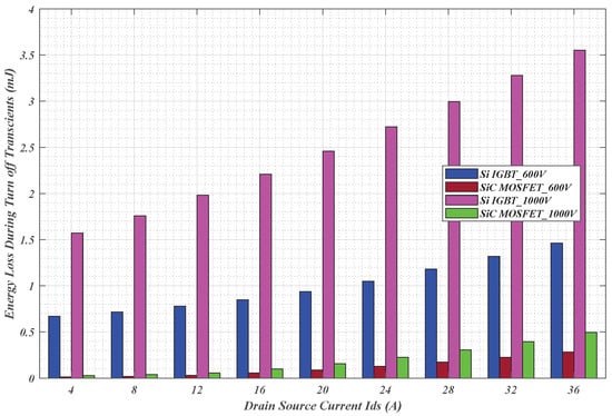 Figure 16. Comparison analysis of turn-off energy loss of Si and SiC MOSFETs at 600 V and 1000 V operating voltages.