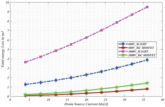 The switching energy loss was quantified for the Si and SiC MOSFETs under the same conditions and with similar parameters as much as possible. Figure 15 shows a comparison between the SiC and Si energy loss E o n across different drain currents, whereas Figure 16 shows the switching energy loss during the turn-off for the Si and SiC MOSFETs. Amongst the ones quantified, i.e., from V d s = 200 V to 1200 V and I d s = 4–36 A, for demonstration purposes, only at V d s = 600 V and 1000 V were plotted against the I d s . It is observed that the energy loss for Si is consistently higher than for SiC at all current levels. The trend shows a near-linear increase in energy loss as the drain current increases, with SiC exhibiting a significantly lower loss than Si. For instance, at V d s = 600 V and I ds = 36 A , SiC energy loss is 0.5185 mJ against Si’s 2.4173 mJ, highlighting a 78 % reduction when using the SiC MOSFETs. The trend continues until 1000 V operation, with SiC maintaining 84 % lower losses (0.93 mJ vs. 5.95 mJ), which reinforces the great advantage of SiC in higher power applications. The total energy loss shown in Figure 17 affirms that even after the summation of the turn-on and turn-off, the SiC energy loss remains significantly lower. At lower current, the SiC MOSFET has a lower conduction loss compared to the Si IGBT; this is because of the pure Ohmic characteristics of the SiC MOSFETs. This shows that the SiC is more preferable in comparison with Si. The converse is true in IGBT due to the presence of the current tail, which increases the switching time, causing non-linear behavior during the turn-off and consequently increased turn-off losses.