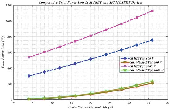 The total cumulative loss in each device forms a significant part of determining the efficiency achieved. The lower the losses, the higher the efficiency. It has been seen that the SiC MOSFETs consistently had lower losses than the Si IGBT; consequently, the efficiency of the SiC, as seen in Figure 21, is higher. It was observed that at lower currents, the losses are significantly lower and increase as the current increases. In tandem with this, the efficiency is higher at lower current, resulting from lower cumulative losses for the same power output. From the figure, the efficiency of 99.78% and 99.03% was observed at I d s = 4 A and I d s = 36 A, respectively, for a SiC MOSFET at 600 V. Comparatively, efficiency of 88.87% and 96.62% was observed at I d s = 4 A and I d s = 36 A, respectively, for a Si IGBT at 600V. Notably, whilst the switching losses increase with the increase in voltages, they do so at a significantly smaller rate at high voltages.