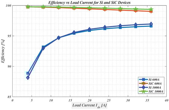Figure 21. The efficiency comparison between the Si and SiC MOSFET when the drain–source current is varied.