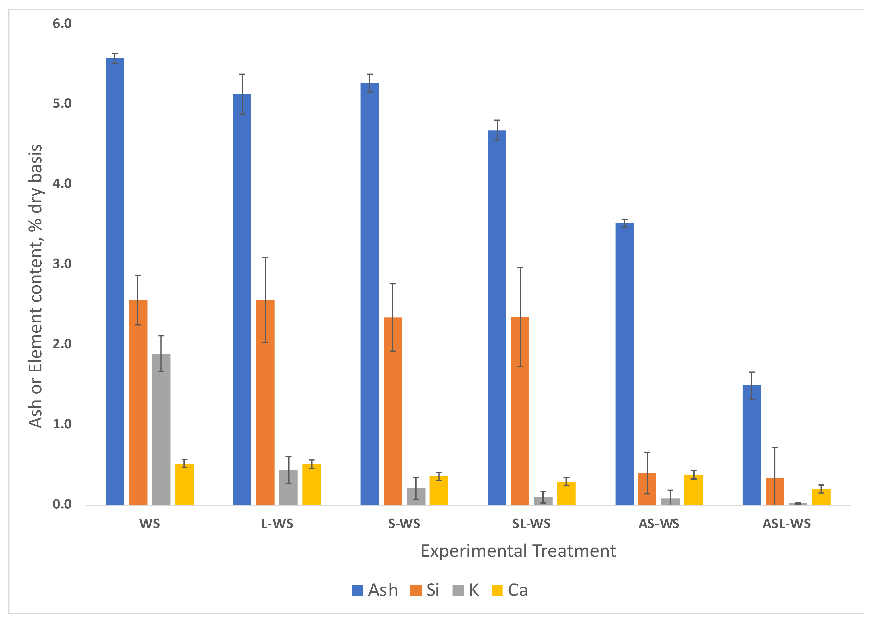 - Edmunds, C.W.; Hamilton, C.; Kim, K.; Chmely, S.C.; Labbé, N. Using a Chelating Agent to Generate Low Ash Bioenergy Feedstock. Biomass Bioenergy 2017, 96, 12–18. [Google Scholar] [CrossRef]