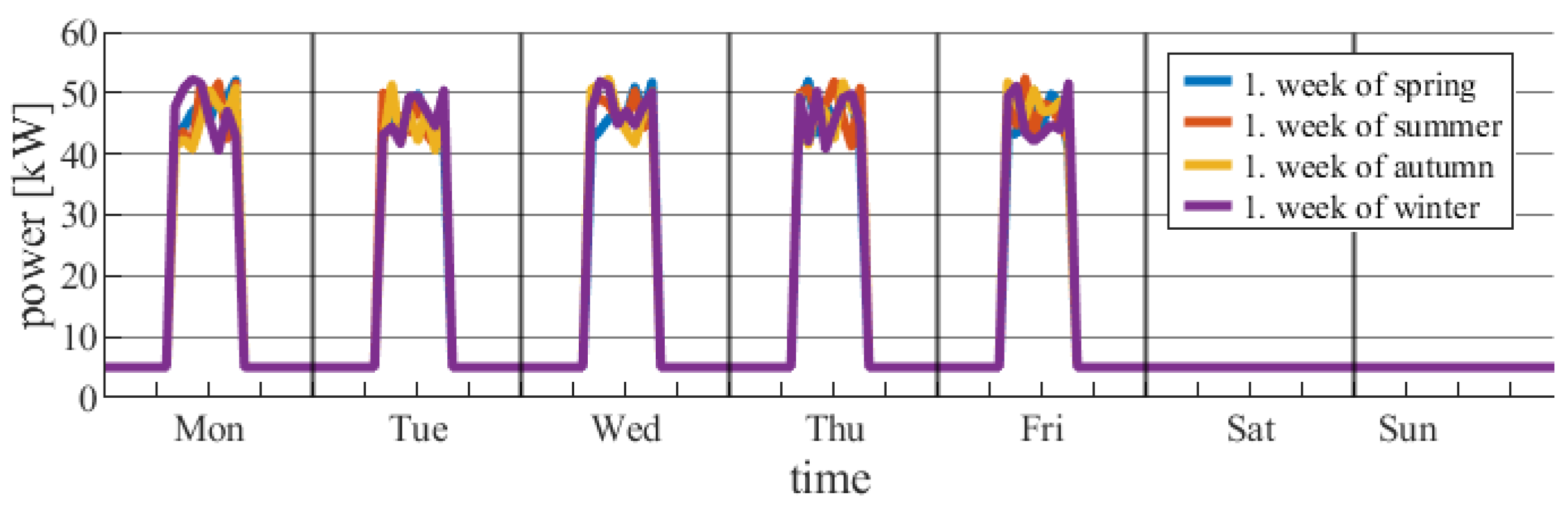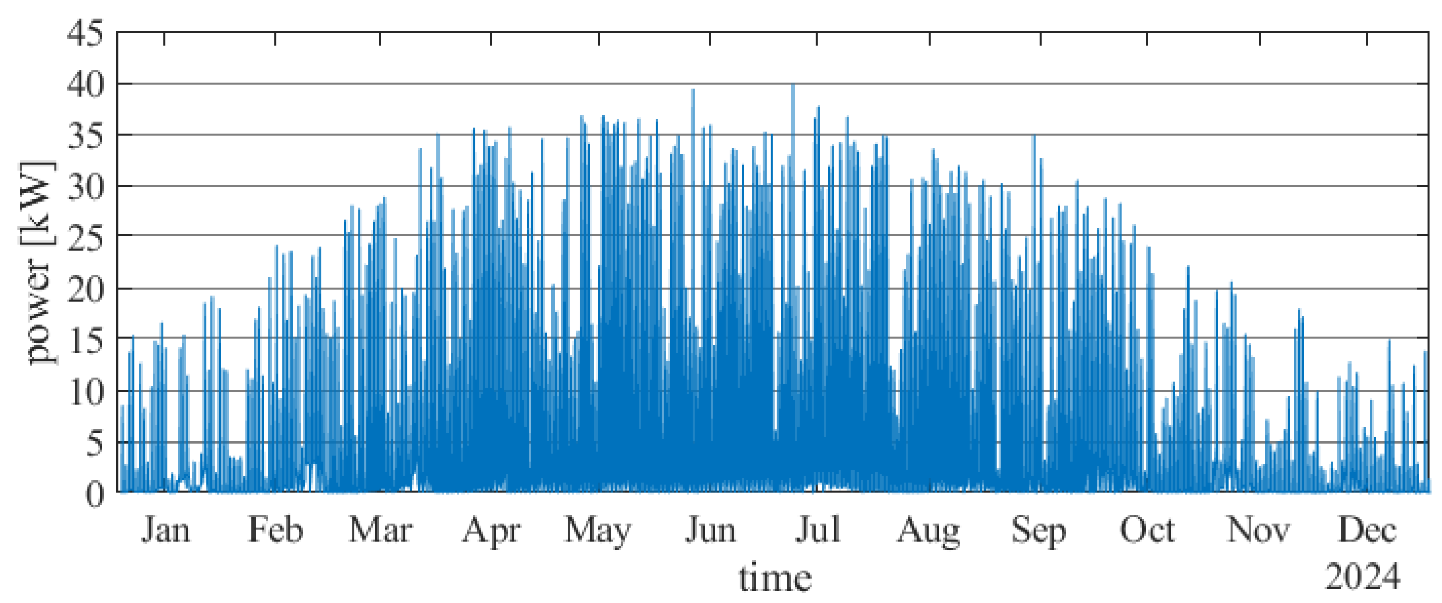 - The year 2024 is used as the reference year for operating the storage system. Due to the way data are processed in the Helioscope software, the simulation repeats after 365 days, effectively extending 2024 as the test year and reproducing the same work schedule and electricity demand patterns;