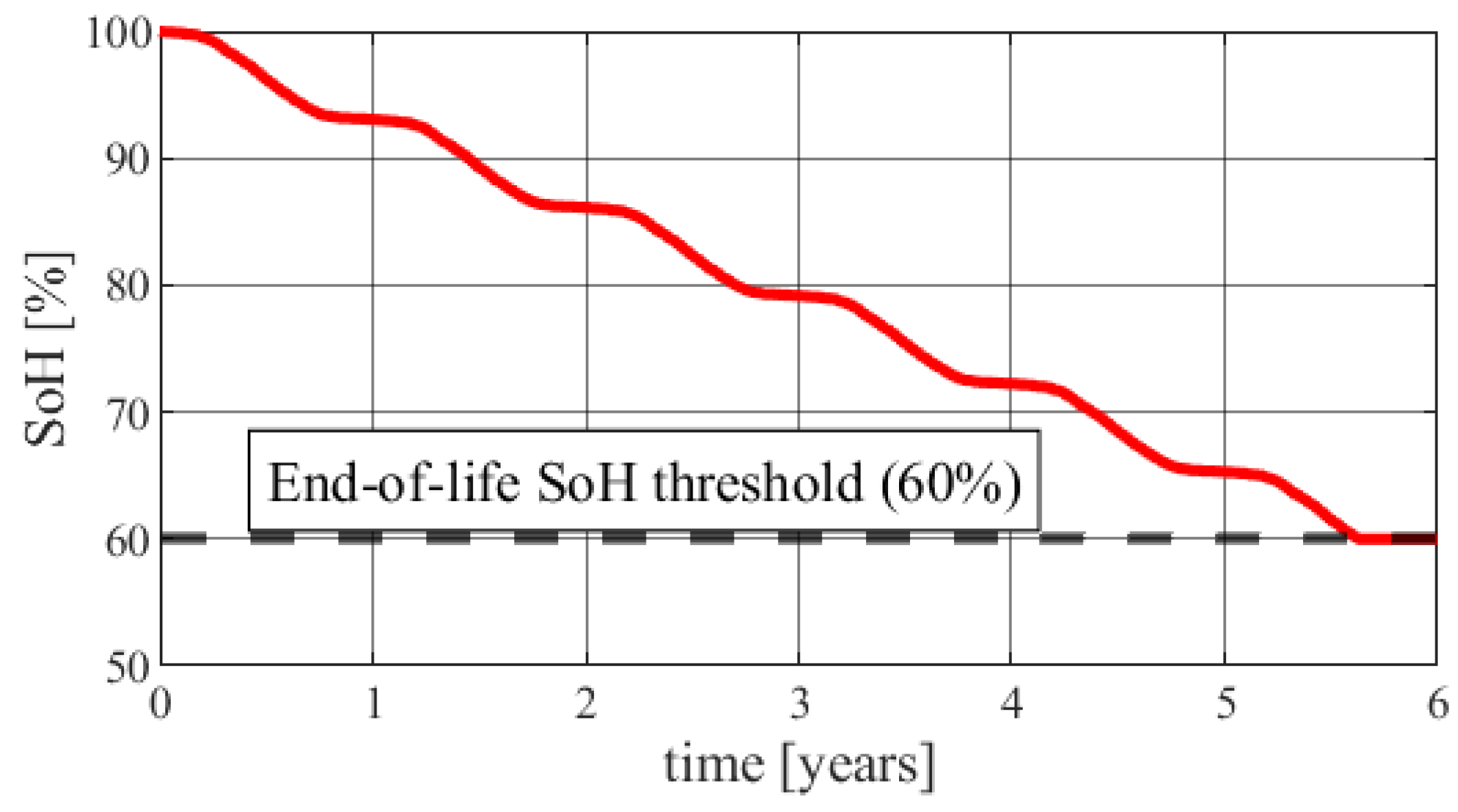 | Cell lifetime (SoH < 60%) [years] | 9 | 9 | 9 | 10 | 10 | 11 |