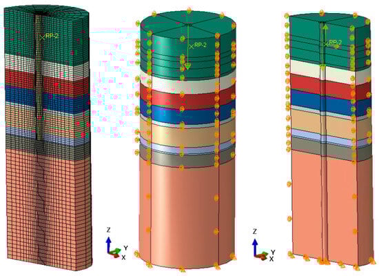 The numerical investigation was conducted using the ABAQUS finite-element program. A numerical model of the deep-water pile-anchor foundation for a floating offshore wind turbine was established. The model boundary conditions are specified as follows: on the lateral boundaries of the soil domain, U1 = U2 = UR3 = 0; at the base of the soil domain, full restraint is imposed, i.e., U1 = U2 = U3 = UR1 = UR2 = UR3 = 0. Contact between the pile and soil is defined as frictional, with a friction coefficient of 0.3. The soil adopts the Mohr–Coulomb constitutive model, and the mesh uses C3D8R elements. The computational model established in ABAQUS is shown in Figure 2. Two representative load inclinations, 30° and 45°, are considered, corresponding to the ultimate limit state (ULS) design load of 9410 kN. The basic calculation cases are listed in Table 2.